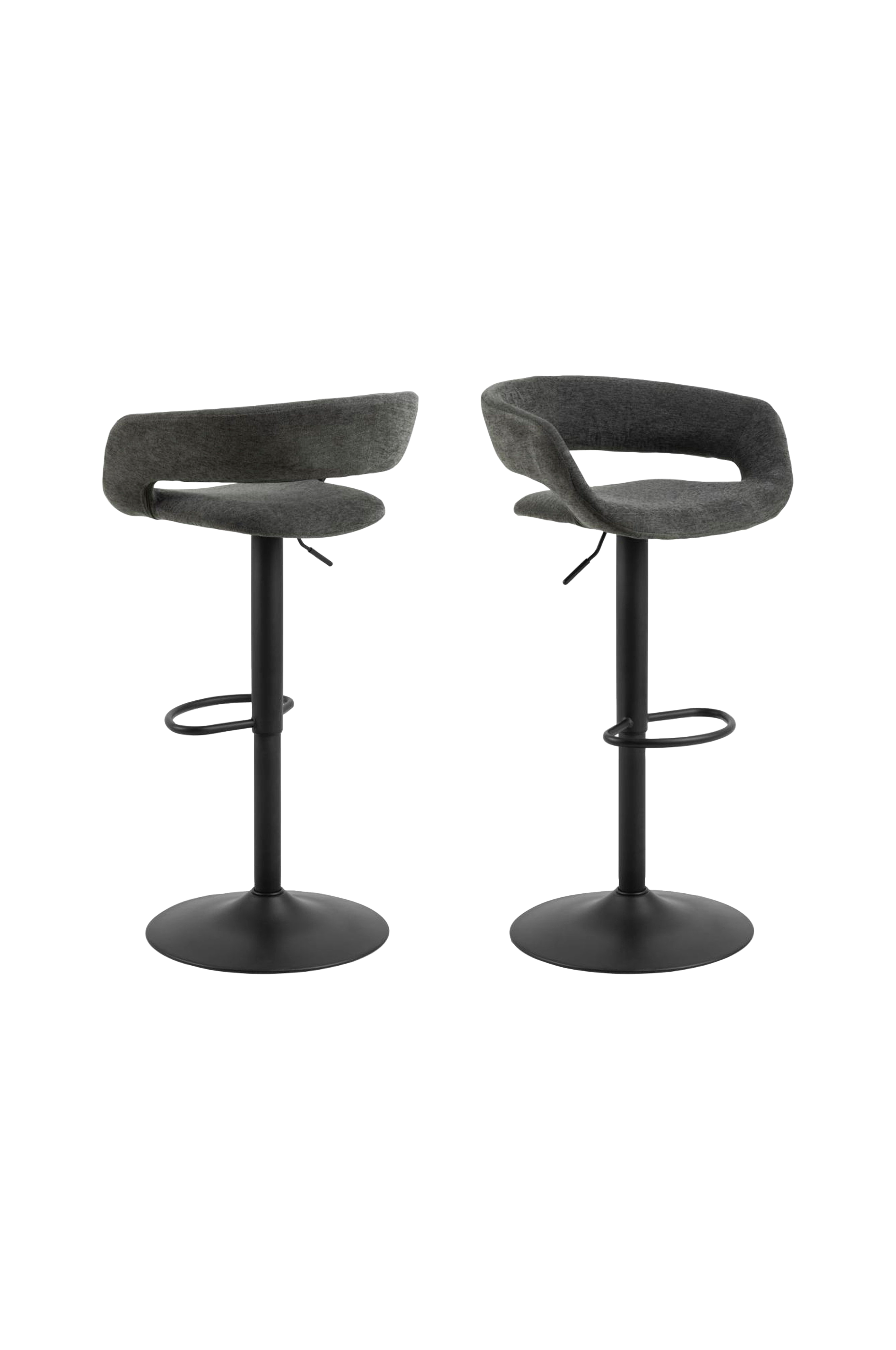 Grace barstol, apia stof mørkegrå 458, trompetfod mat sort ru pulverlakeret stål, med gaslift og drejning, kasse 2 stk - denne højdejusterbare barstol med rundt sæde er både komfortabel og moderne. Det mørkegrå chenillelignende betræk føles blødt mod huden og gør det mere behageligt at sidde, mens den diskrete udskæring i ryggen giver barstolen et nyt look. Den står på en rund, sort base med drejefunktion, som giver stabilitet og gør det lettere at bevæge sig.