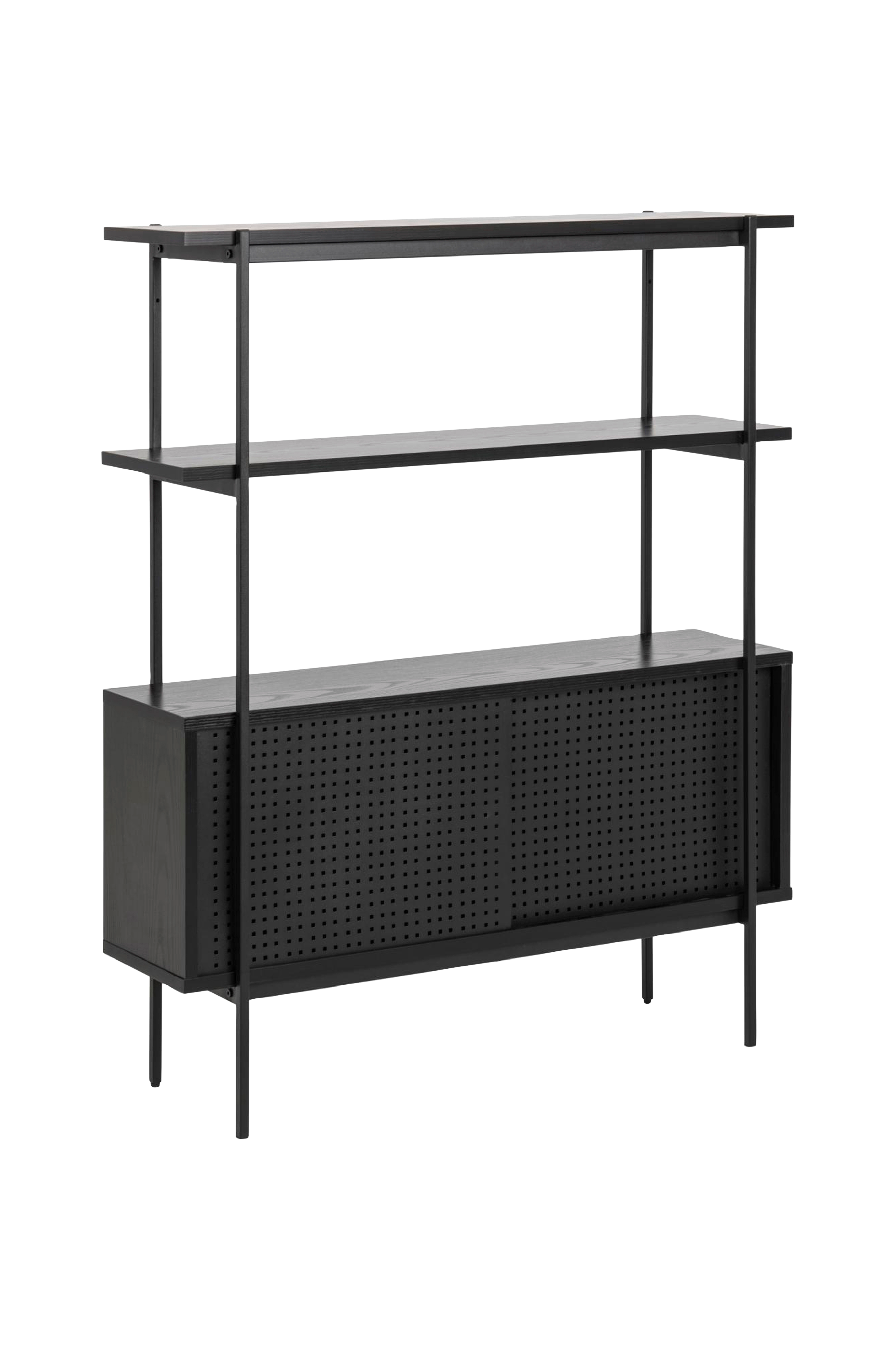 Reol med rene linjer og en let struktur, som giver et moderne udtryk som passer en moderne livsstil, og kan kombineres med alle indretningsstile. Hyldeflade af træ med sort askfinish og pulverlakeret metalstel. Bag skydelågerne kan du opbevare ting du ikke vil have fremme. Lad den moderne reol stå i centrum i din dagligstue.
