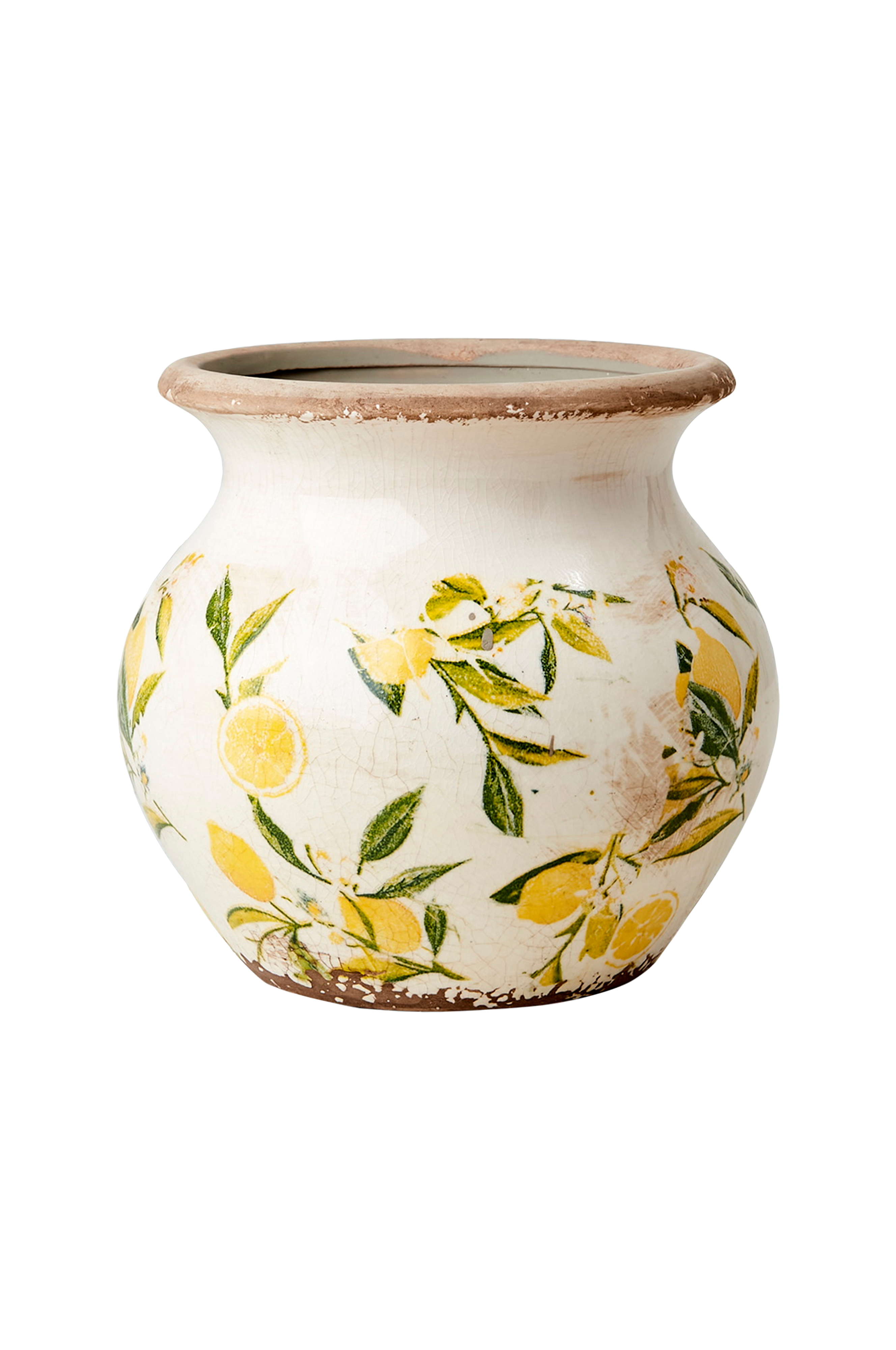 Smuk urne med citronmønster. Porøst materiale, brug vandtæt bakke for at undgå pletter. Indvendige mål 10 cm.