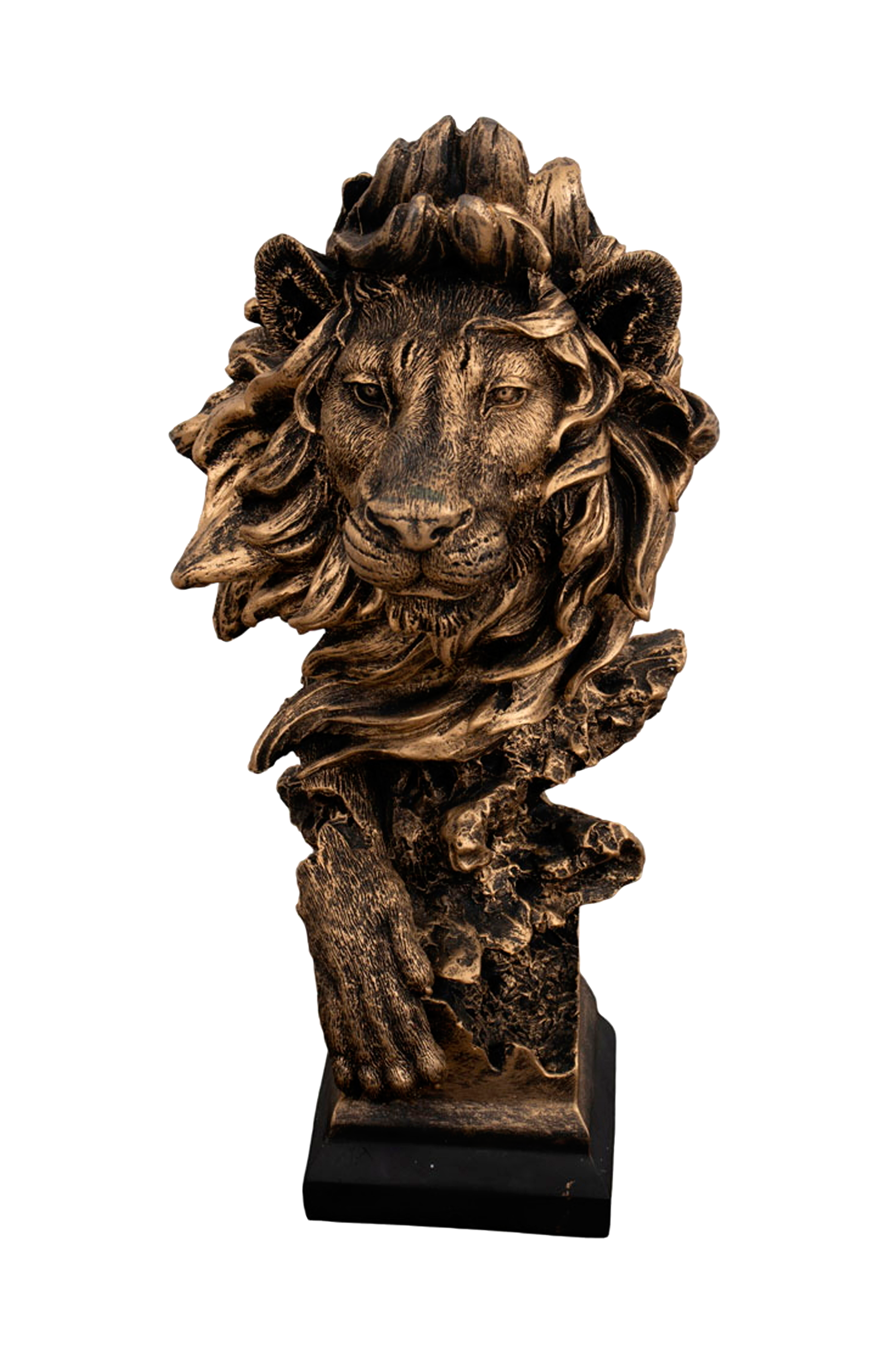 Løvestatue i polyresin. Statuen er 39 cm høj, 20 cm bred og 18 cm dyb.