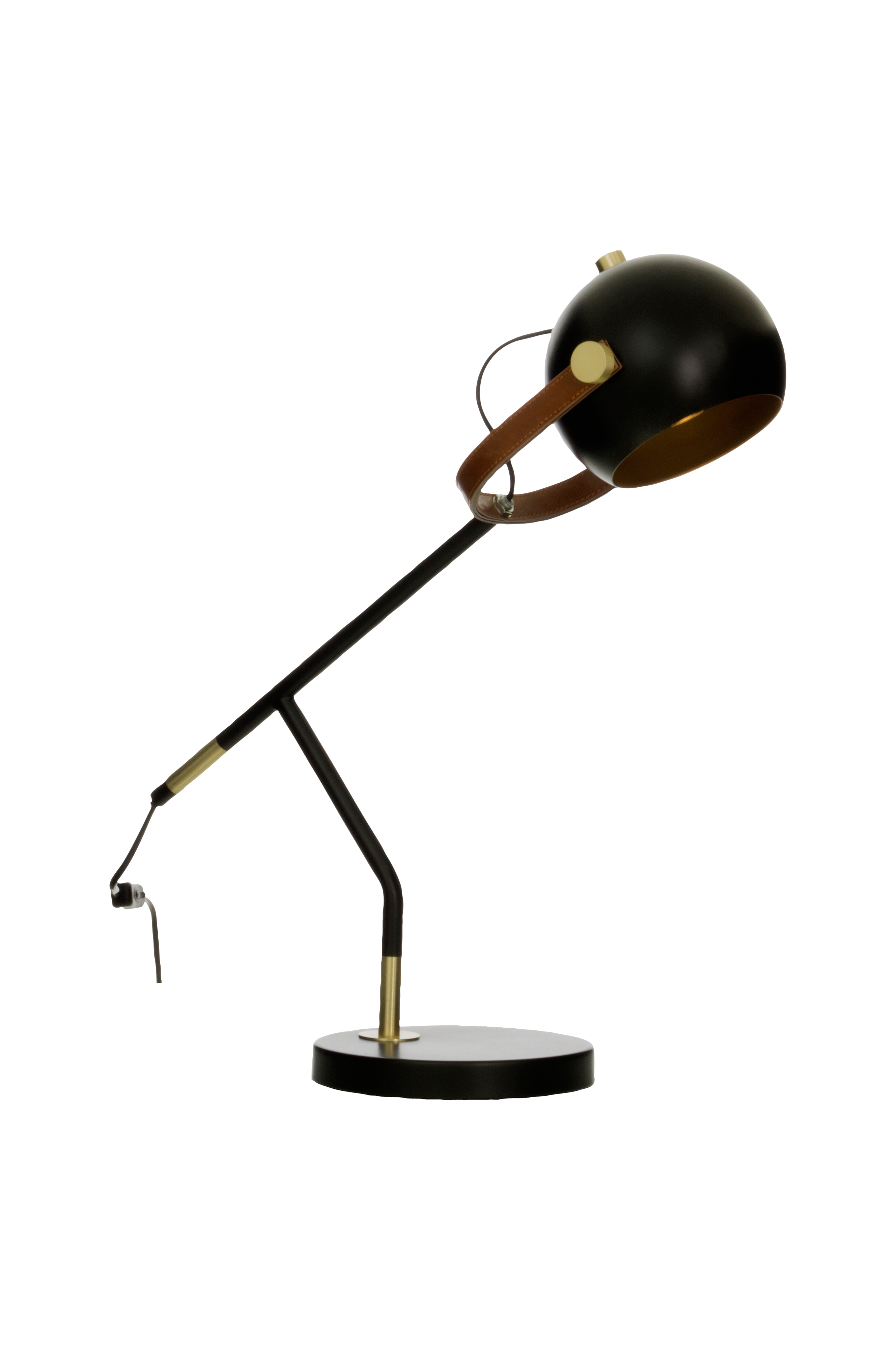 BOW bordlampe. Lampehovedet kan justeres efter ønske. Afbryder på ledningen. Materiale: metal og kunstlæder