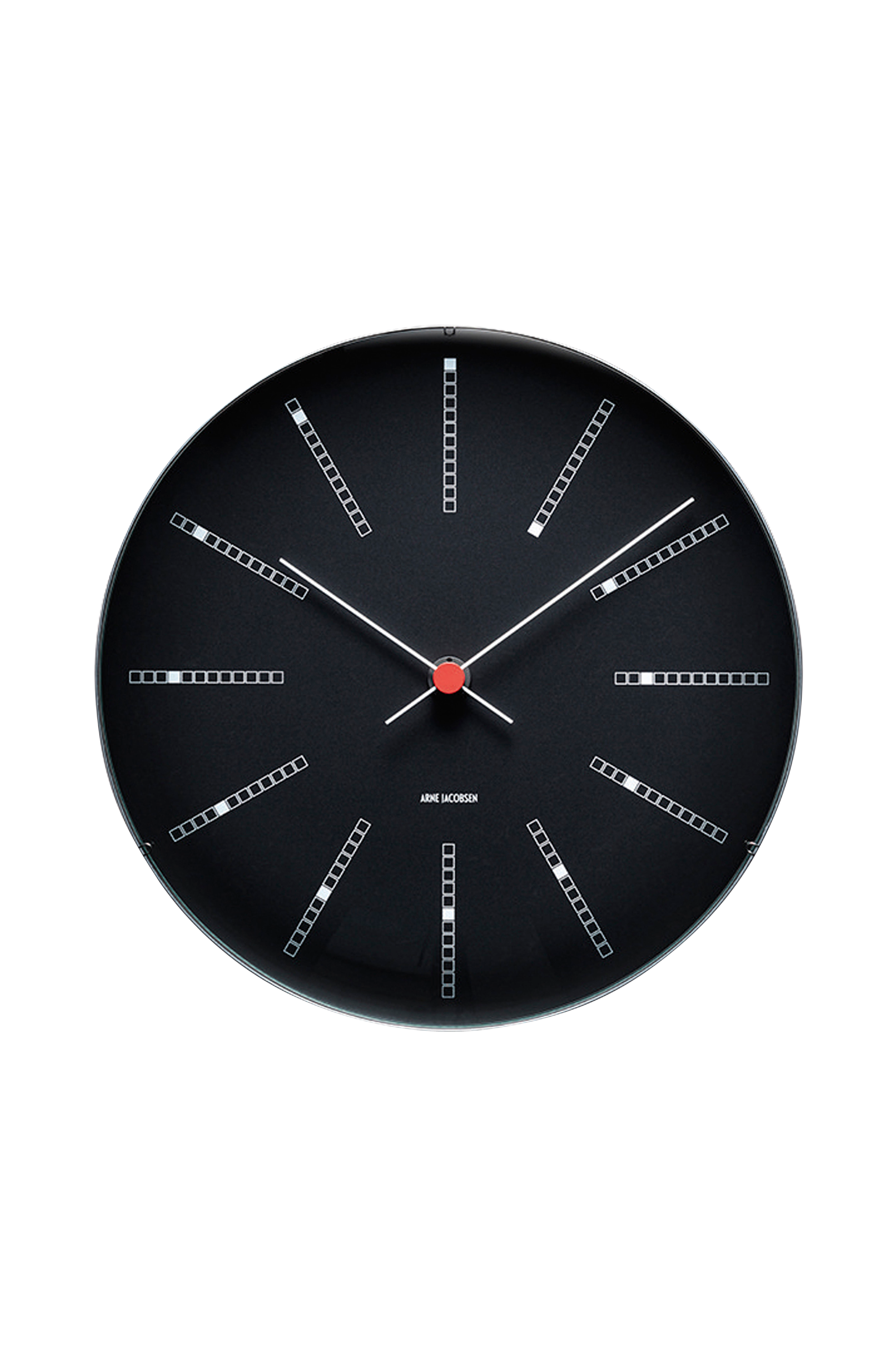 Det stilrene Bankers vægur i sort fra Arne Jacobsen Clocks er 21 cm i diameter. Designet er klassisk med et twist af små, kreative detaljer som f.eks. den elegante spiral som illustrerer tidens gang rundt på urskiven. Bankers-uret blev oprindeligt skabt til at bruge i Nationalbanken i 1971, men nu kan alle få glæde af det minimalistiske design derhjemme. Her får du et lækkert og tidløst designerur med masser af attitude i din indretning. Uret findes også i en model med Ø29 cm.