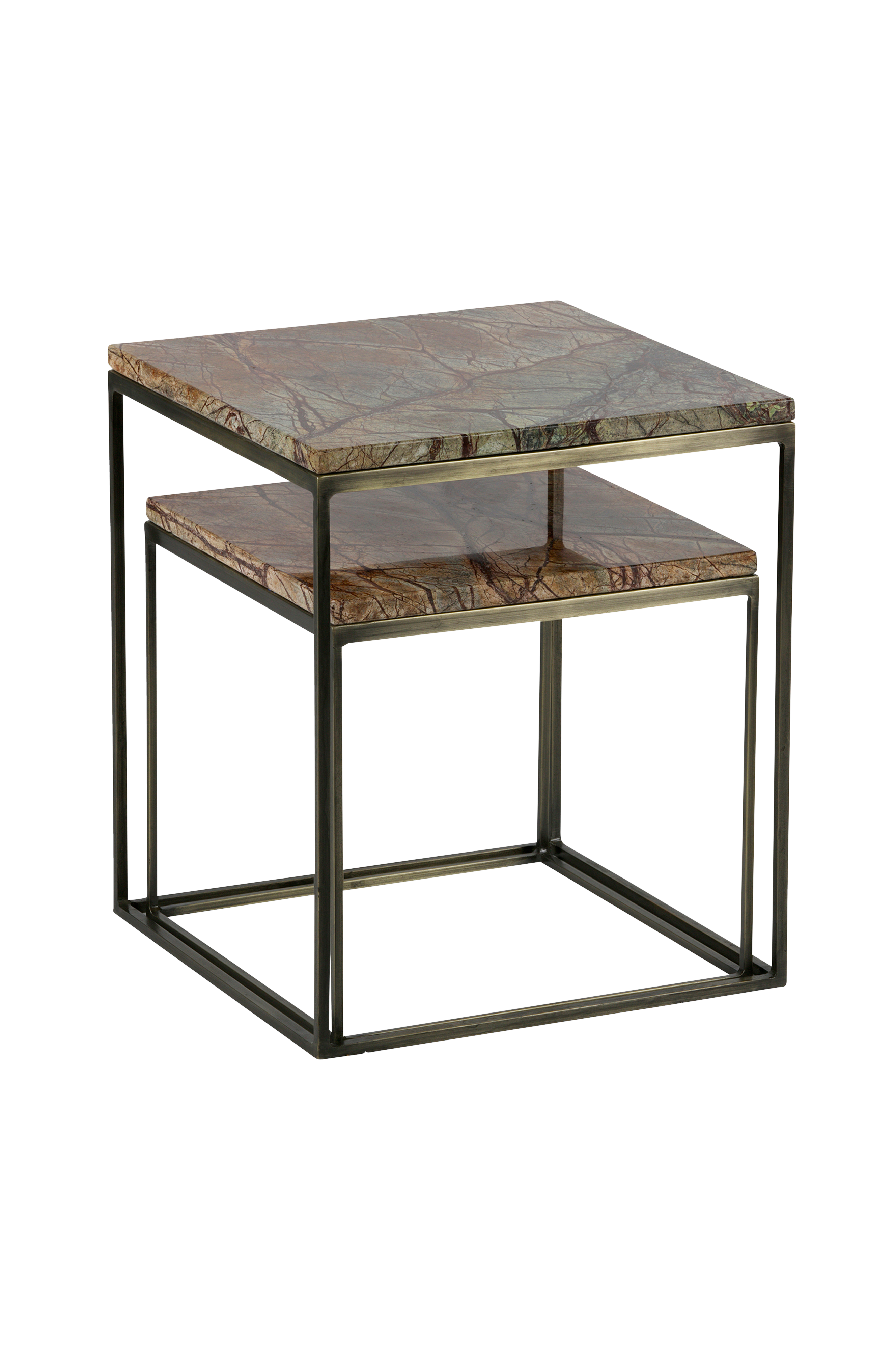 Et flot sæt med sideborde! Sæt med 2 - Mellow sidebord har en bordplade af marmor med et flot mønster. Benene er af metal (jern) med antikmessing finish. Det store bord har en højde på 45 cm og en bredde og dybde på 40 cm. Det lille bord har en højde på 35 cm og en bredde og dybde på 36 cm. Begge borde har en bordplade med en tykkelse på 20 mm.