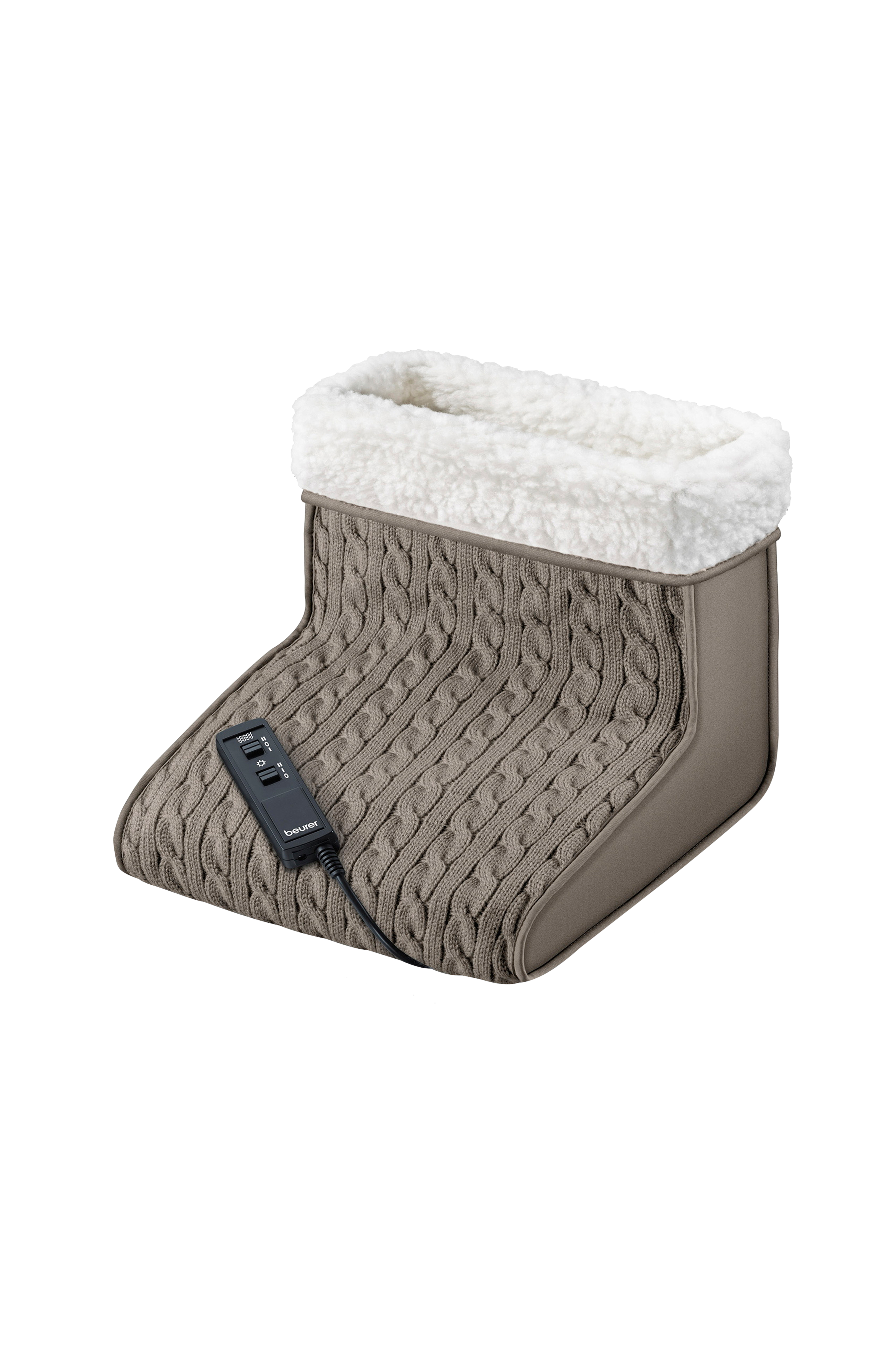 Fodvarmer med 2 temperaturindstillinger og 2 forskellige massagehastigheder. Ydersiden i strikket design og indersiden af blød fleece. Aftagelig inderdel som kan vaskes i hånden.