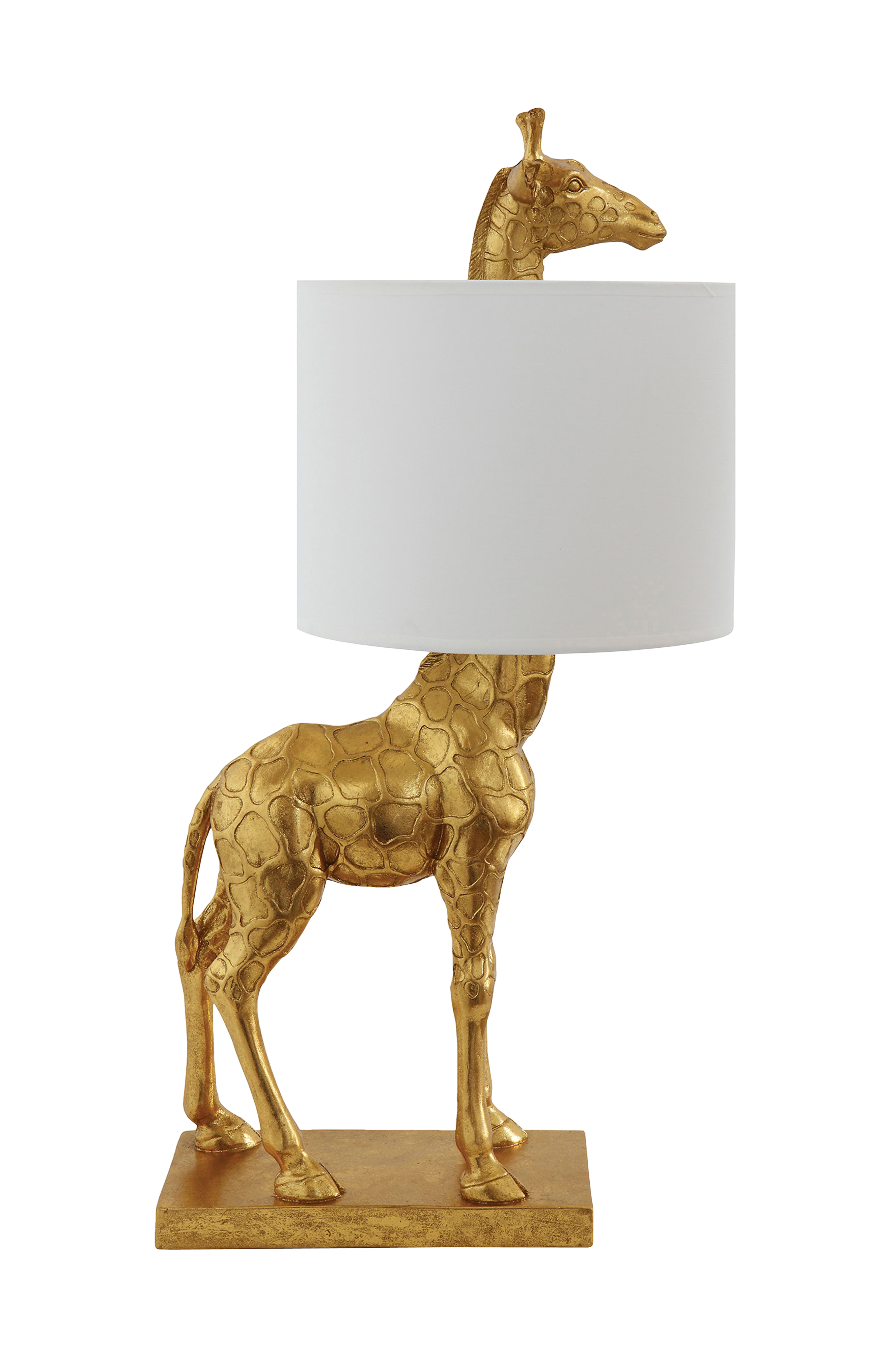 Bordlampe Silas. Denne guldfarvede giraf er i polyresin og med skærm i hør.