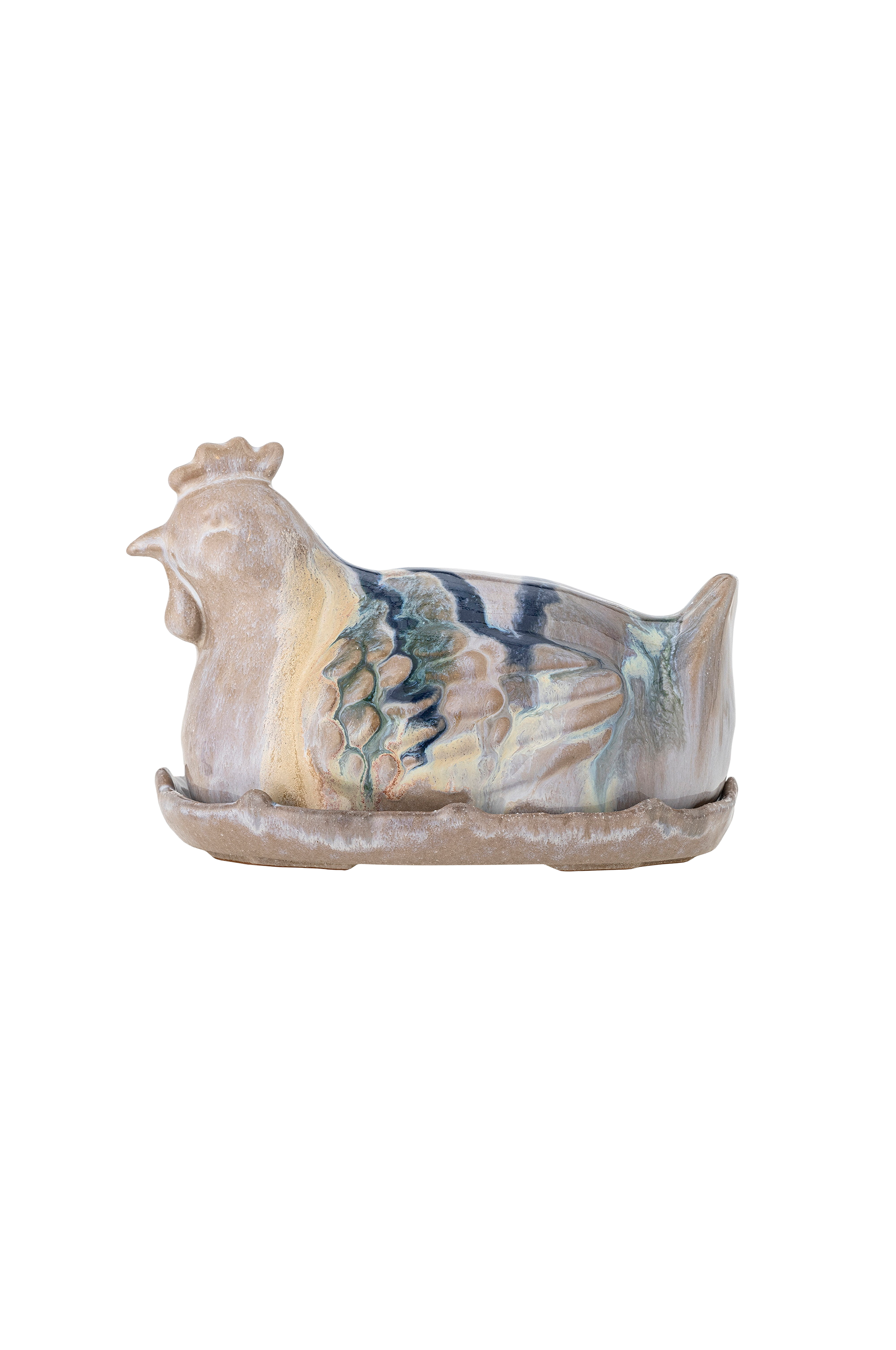 heni butter box fra creative collection er et charmerende stentøjsfad formet som en høne. Brug den til opbevaring af smør eller æg. Den unikke reaktive glasur skaber et livligt samspil af naturlige farver. Hvert smørfad er helt unikt og varierer i farvemønstre og nuancer. Glasuren kombinerer bløde jordfarver med nuancer af blå, rosa og grøn, hvilket giver den et kunstnerisk udtryk. Smørskålen er en praktisk og dekorativ tilføjelse til dit køkken, som giver personlighed og charme til dit spisebord. Dimension: l19xh13xw13 cm