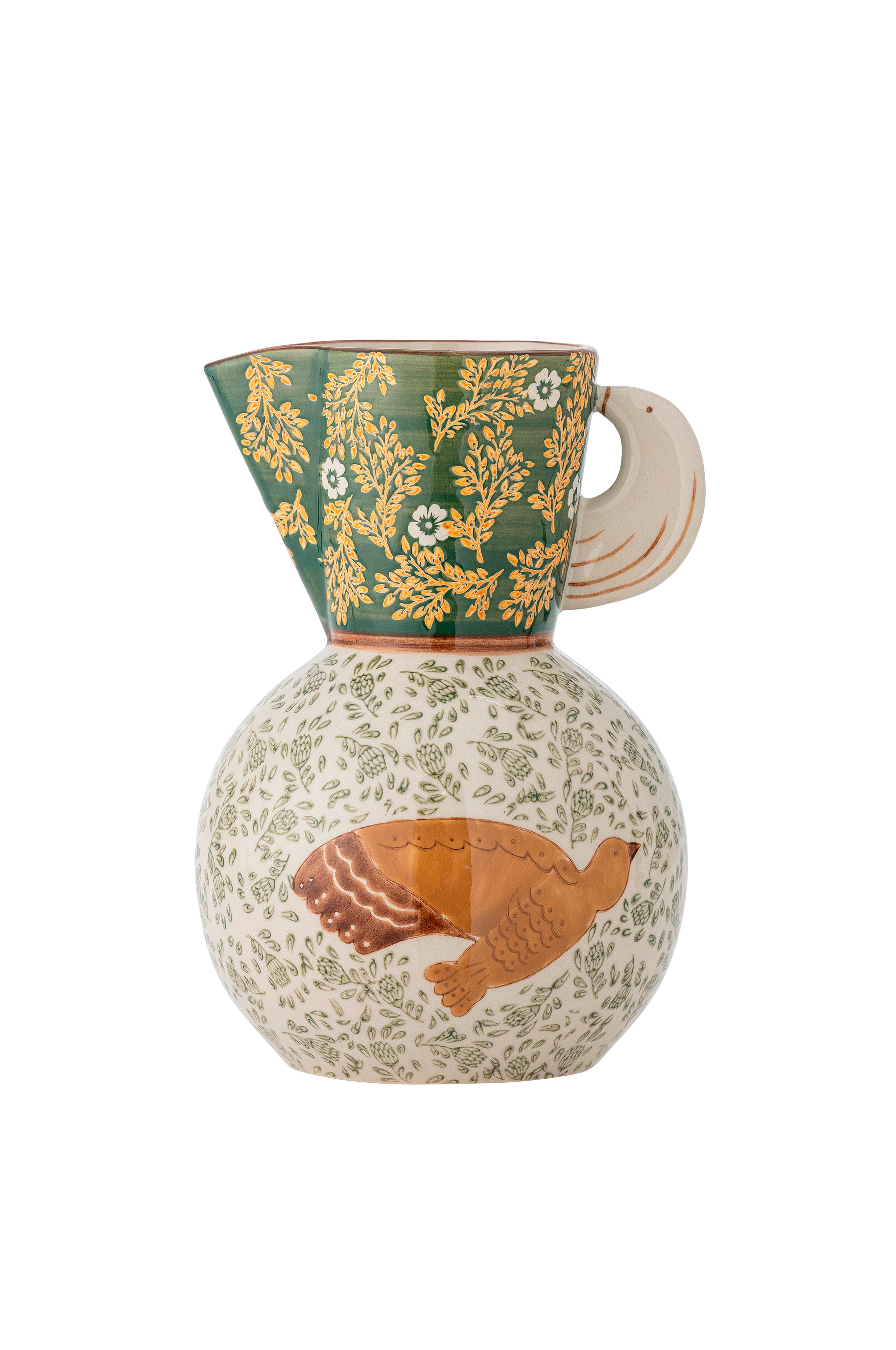 Hezha -kanden fra bloomingville er lavet af stentøj og har en håndmalet overflade med blomstergrene, blomster og en fugl i flugt. En skulpturel hank fuldender designet. Der kan forekomme små variationer i mønster og intensitet, hvilket gør hvert stykke unikt.