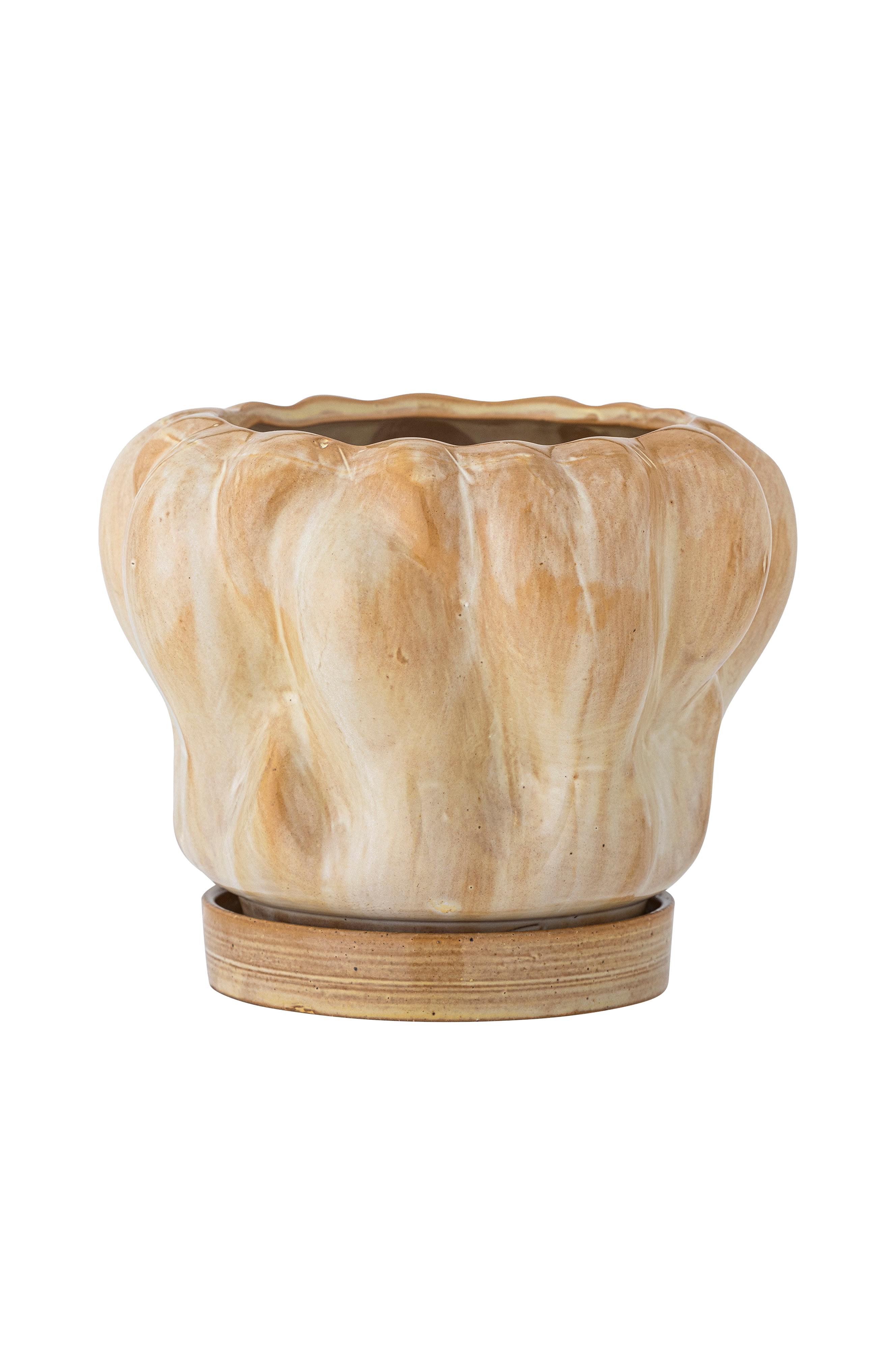 hollis urtepotte med underkop fra bloomingville er belagt med en varm, naturfarvet glasur i en skinnende finish, som står i smuk kontrast til den abstrakte form. Stil den oven på en kommode eller i en vindueskarm sammen med din yndlingsplante, og pryd dit hjem med en tidløs og dekorativ tilføjelse. Glasurens natur kan resultere i variationer i farven. Dimension: d20xh15,5 cm