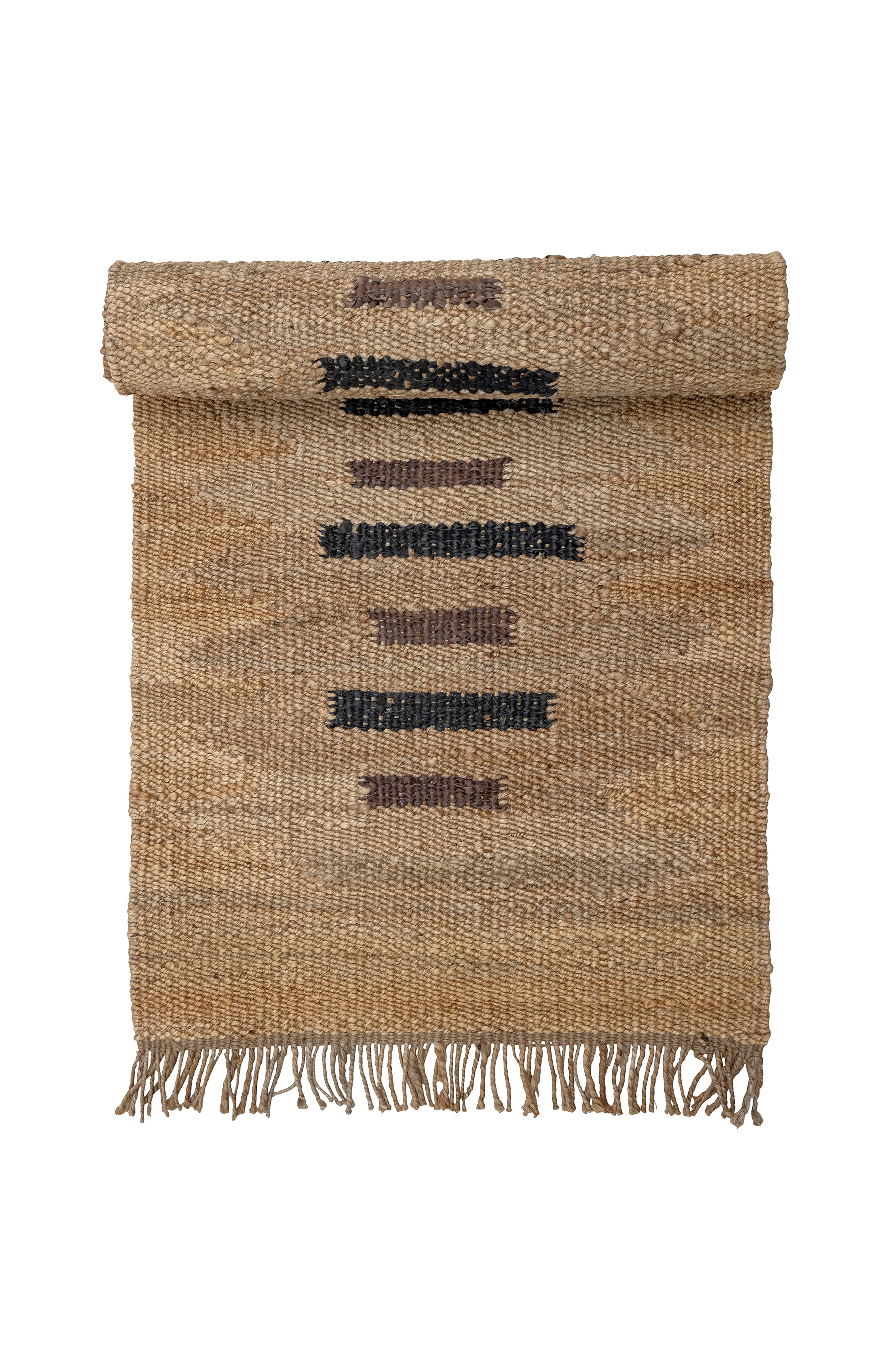 Vilde tæppe fra Creative Collection er lavet af jute med læderdetaljer og giver indretningen en naturlig følelse. Det enkle men kreative design med sorte og brune læderdetaljer passer fint i alle rum. 90% jute og 10% læder.