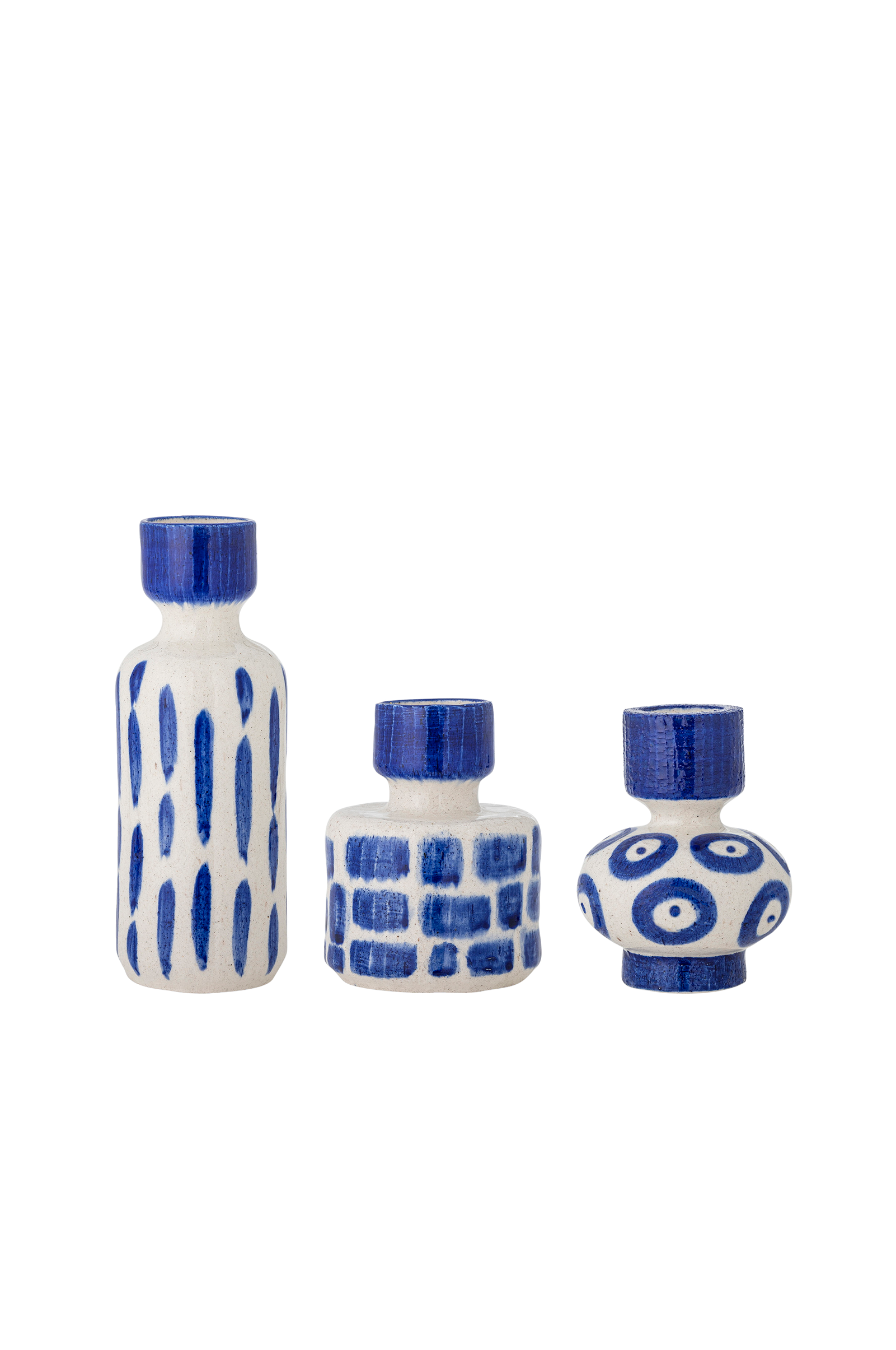 Romane vase fra creative collection er et sæt med tre stentøjsvaser, der hver især er håndmalet i forskellige toner. Deres former har lodrette streger, ringe og lineære motiver.