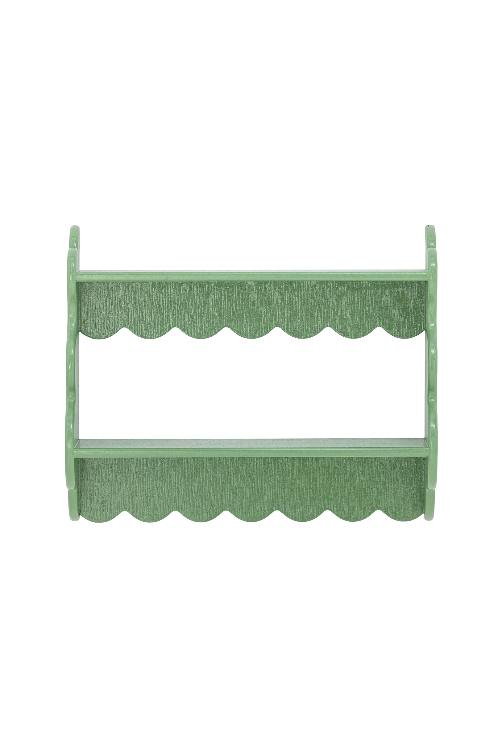 Salla-hylden fra creative collection er en malet hylde i grantræ designet til udstilling eller opbevaring. Den har en glat overflade, der fremhæver træets årer, og en skællet kant. Variationer kan forekomme.
