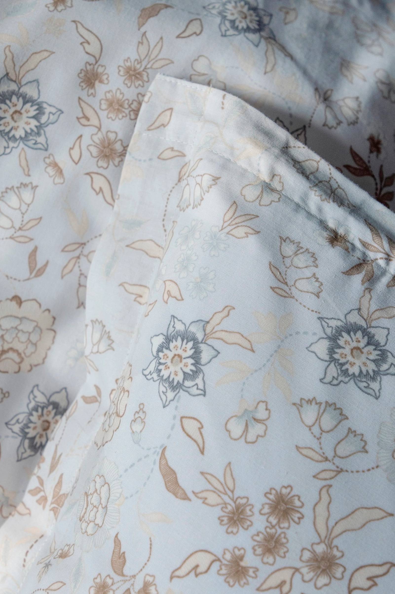 Liva-dynebetrækket udstråler romantik med sit blomstermønster i bløde blå nuancer. De sarte blomster hviler blidt på 100 % blødt bomuld og skaber en følelse af ro og sommerlig lethed. Farverne er subtile og feminine som et blidt pust af tidligt morgenlys. Liva er perfekt til dem, der elsker det nostalgiske og drømmende. Det er et dynesæt, der forvandler soveværelset til en blomstrende, romantisk oase. Dynebetrækket og pudebetrækket har lynlås i bunden, så det er nemt at lukke. Pudebetrækket er designet med en 3 cm oxfordkant for et raffineret touch. Sættet indeholder 1 dynebetræk og 1 pudebetræk, og det er smukt pakket i en elegant æske.
