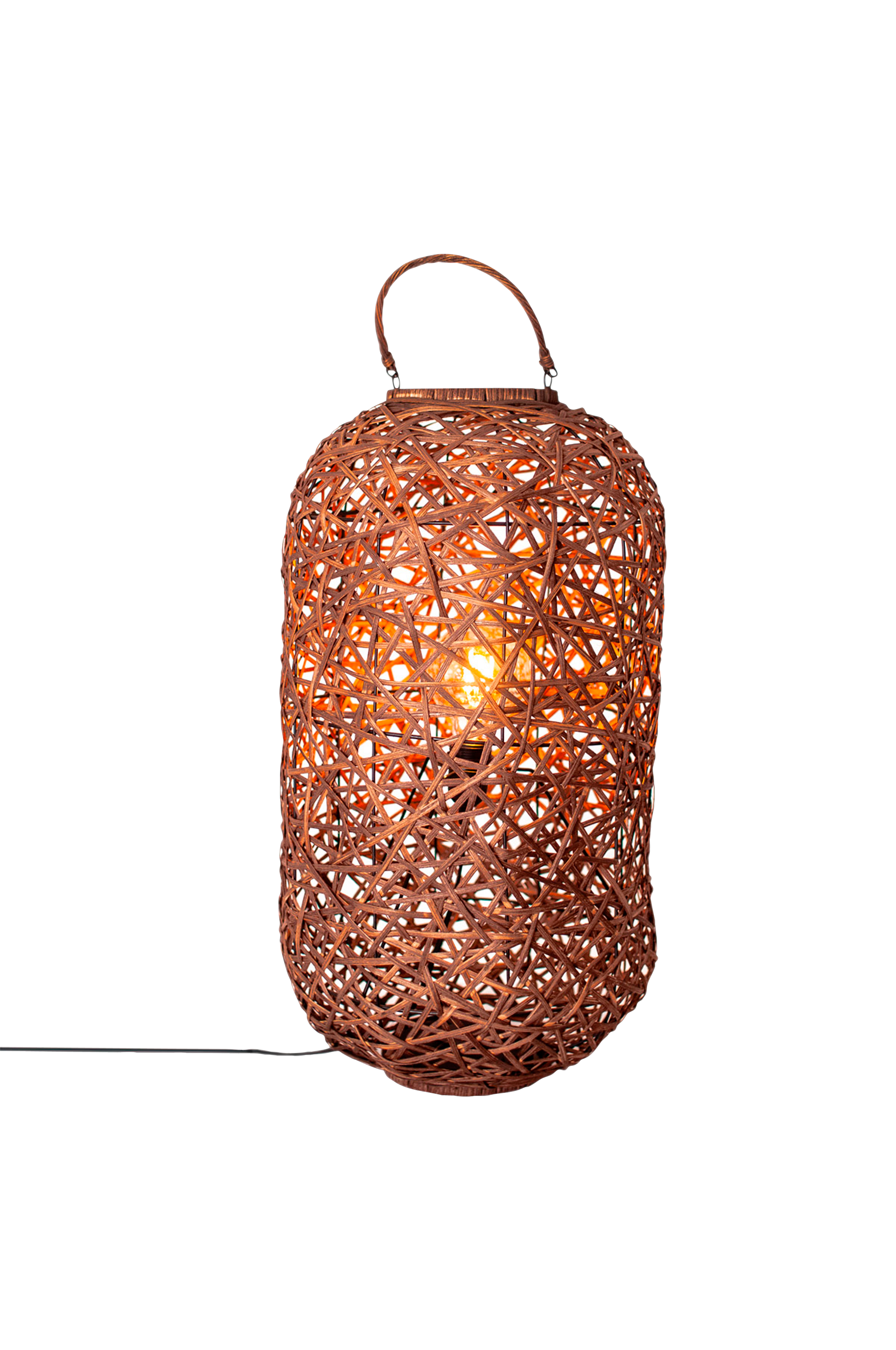 Se gulvlampen i et helt nyt lys. Diego håndlavet gulvlampe er lavet i smuk rotting med hulmønster, og køber man en amberfarvet pære giver det er smukt lysskær. Formen ligner en lanterne, og den kan bruges både indendørs og i isoleret udestue, hvor der ikke er fugt og kulde. Det praktiske håndtag og den lange ledning på 250 cm gør at lampen er let at flytte rundt. Lampen måler 65 cm i højden og har en diameter på 35 cm. Pære til Diego gulvlampen skal købes separat. Vi anbefaler en pære med sokkel E27 med 60 mm i diameter. Du kan gøre lampen dæmpbar ved at tilslutte en dæmper.