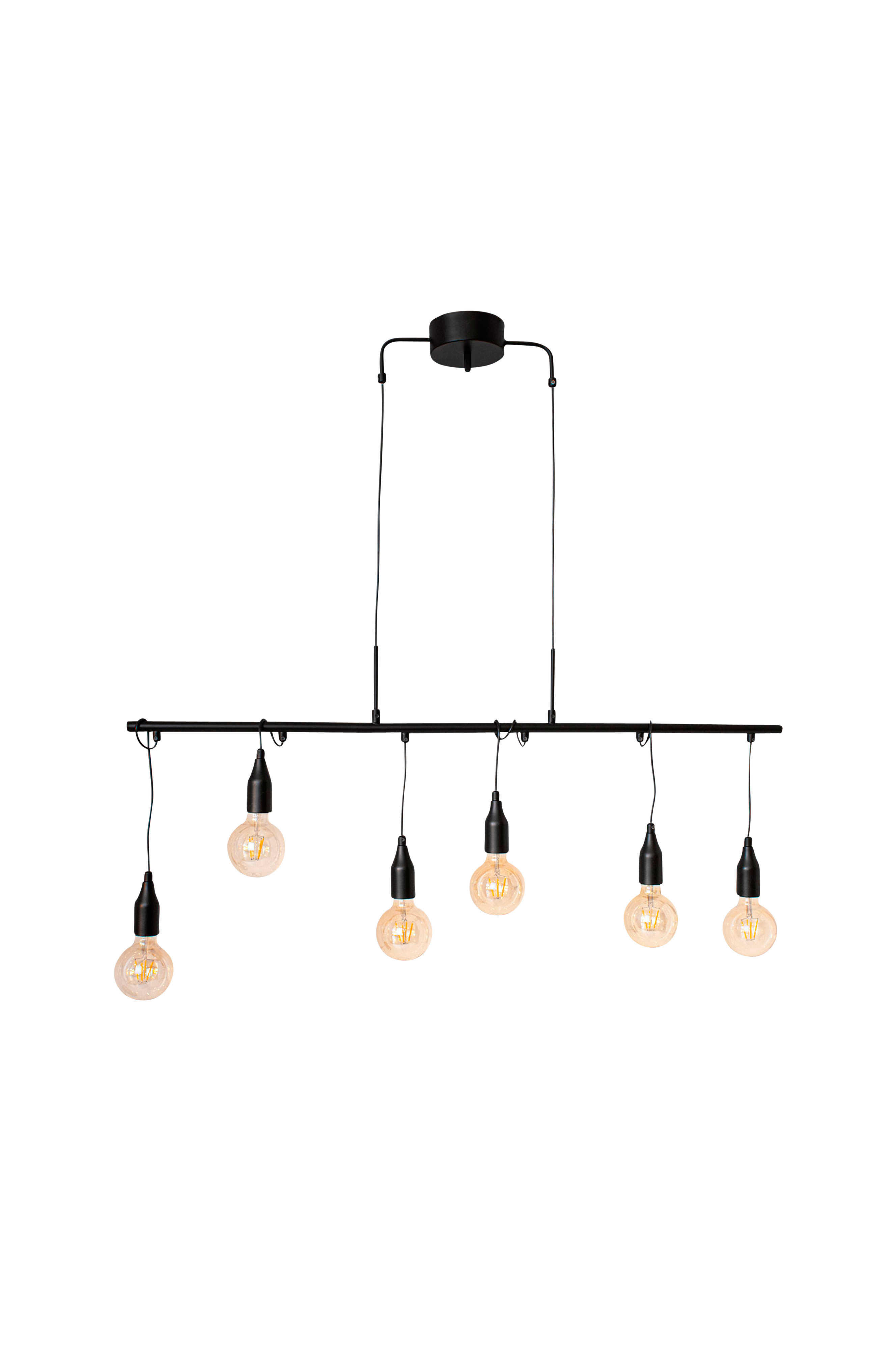 En loftlampe ud over det sædvanlige, som kan hæves og sænkes. Du kan også ændre udtrykket takket være kabler som du kan sno og ændre længden på. Leg med Skyline loftlampen, og giv din indretning et løft. Det interessante metalstel i T-form giver et iøjnefaldende udtryk i rummet. Kablerne på de seks pærer er af plast og kan snos rundt om stellet eller hænge som de er. Til denne loftlampe skal du bruge seks pærer med E27-sokkel. Vi anbefaler 95 mm i diameter, og både amberfarvet og transparent ser flotte ud. Med Skyline loftlampe kan du lege med rummets udtryk og ændre det i forhold til dagens humør. Lampen kan bruges både i stuen, soveværelset og køkken eller entré, og den kan dæmpes. Dæmper og pære medfølger ikke. Højden på lampen er 60 cm, bredden 13 cm og længden 110 cm. Ledningslængde går op til 120 cm
