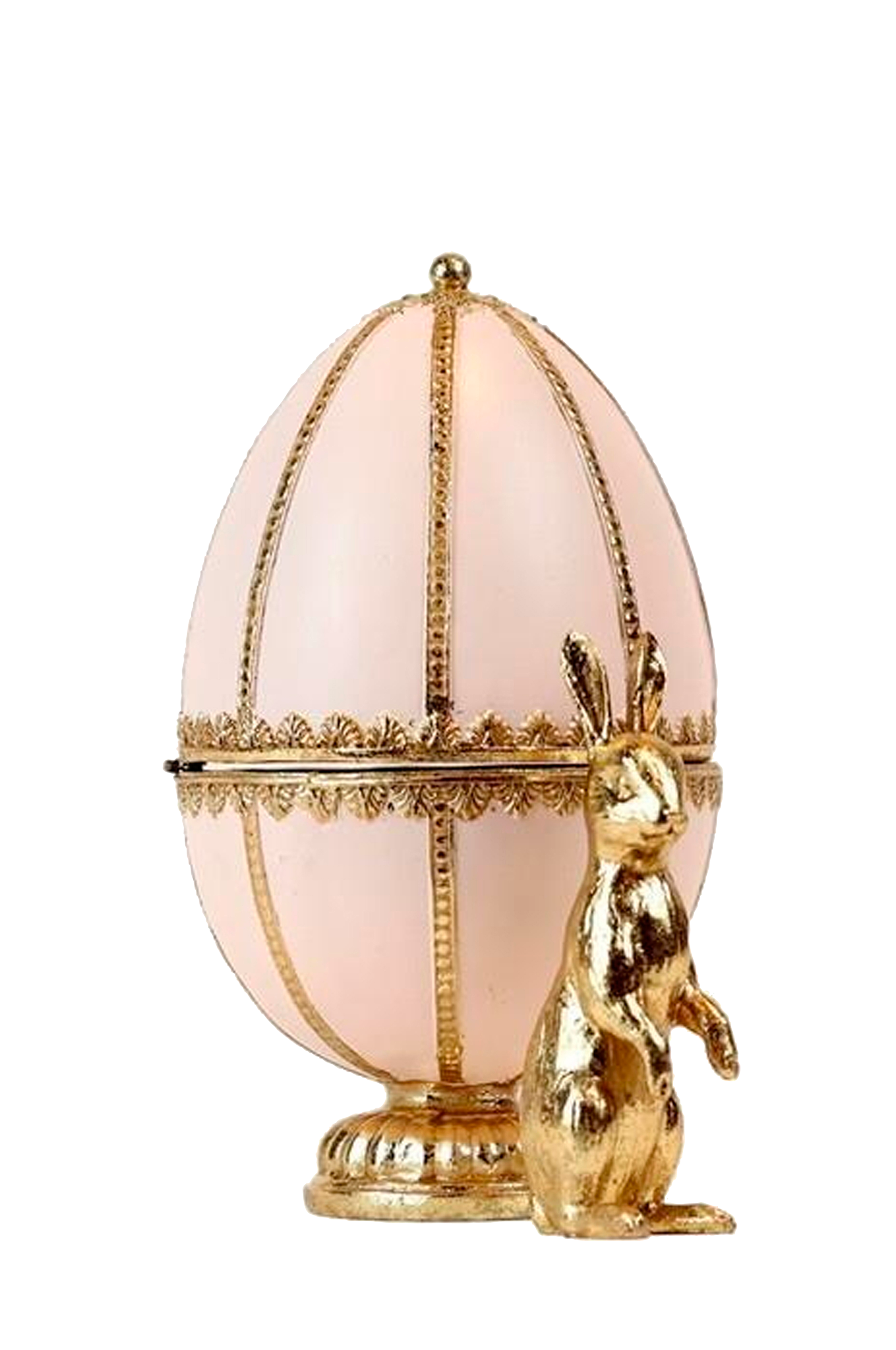 Udformet som et pynteæg, der kan åbnes og gemmer en kanin indeni.