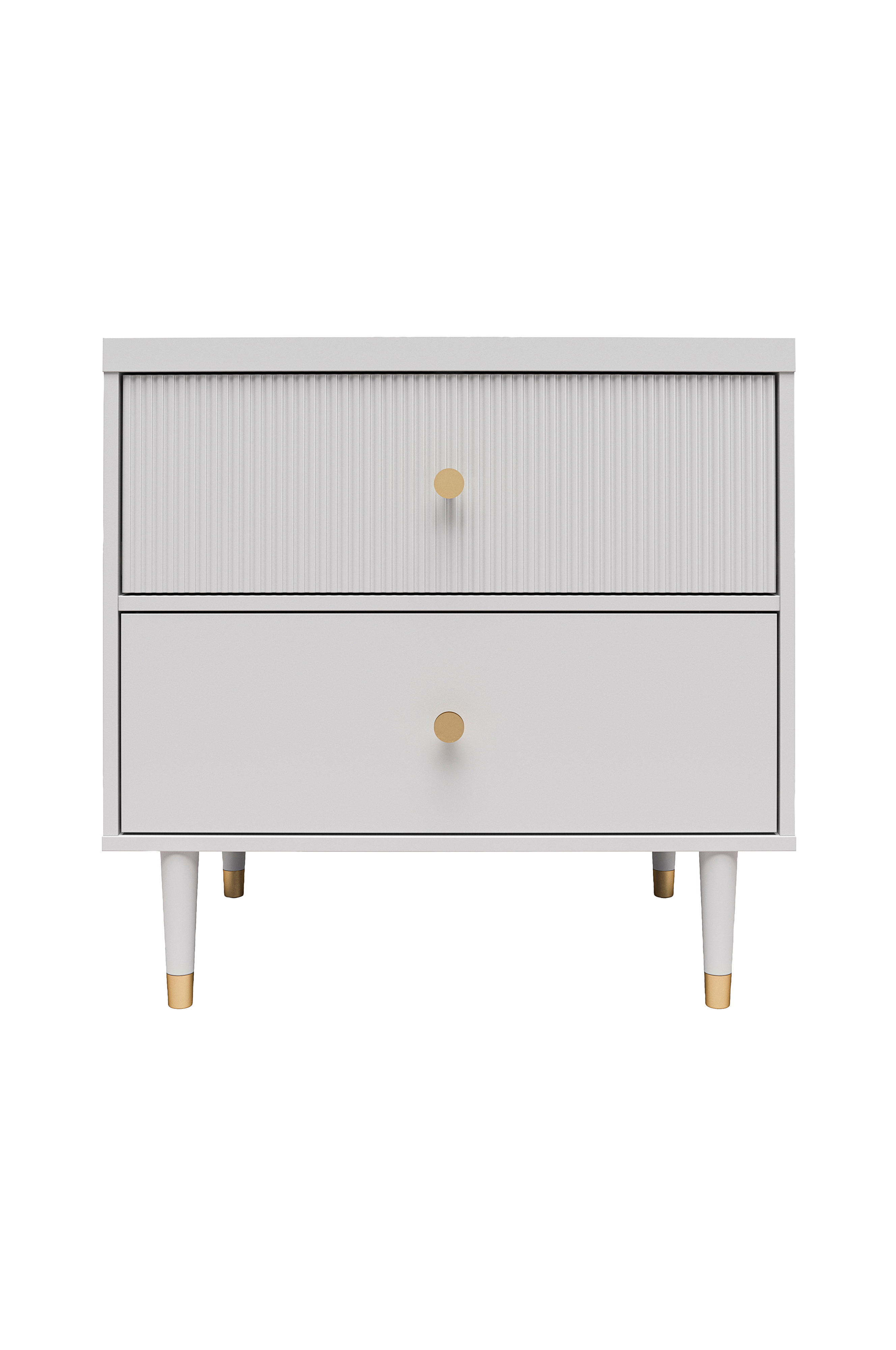 Det moderne, smarte design af elizabeth natbordet smelter perfekt sammen med moderne konturer fra midten af århundredet for at skabe et øjeblikkeligt fokuspunkt i ethvert rum. Fabelagtigt designet med 1 riflet struktureret skuffefront og 1 glat, begge prydet med glamourøse guldskuffetræk. De 2 store skuffer er præcis, hvad du har brug for til diskret at gemme alle dine vigtigste ting ved sengenžá wink wink. elizabeth natbordet er konstrueret af slidstærkt malet mdf og fås i flere smukke finishes og står smukt på koniske ben af massivt træ med fødder med guldkappe, hvilket skaber et sofistikeret og poleret look, der passer til en moderne dronning som dig.