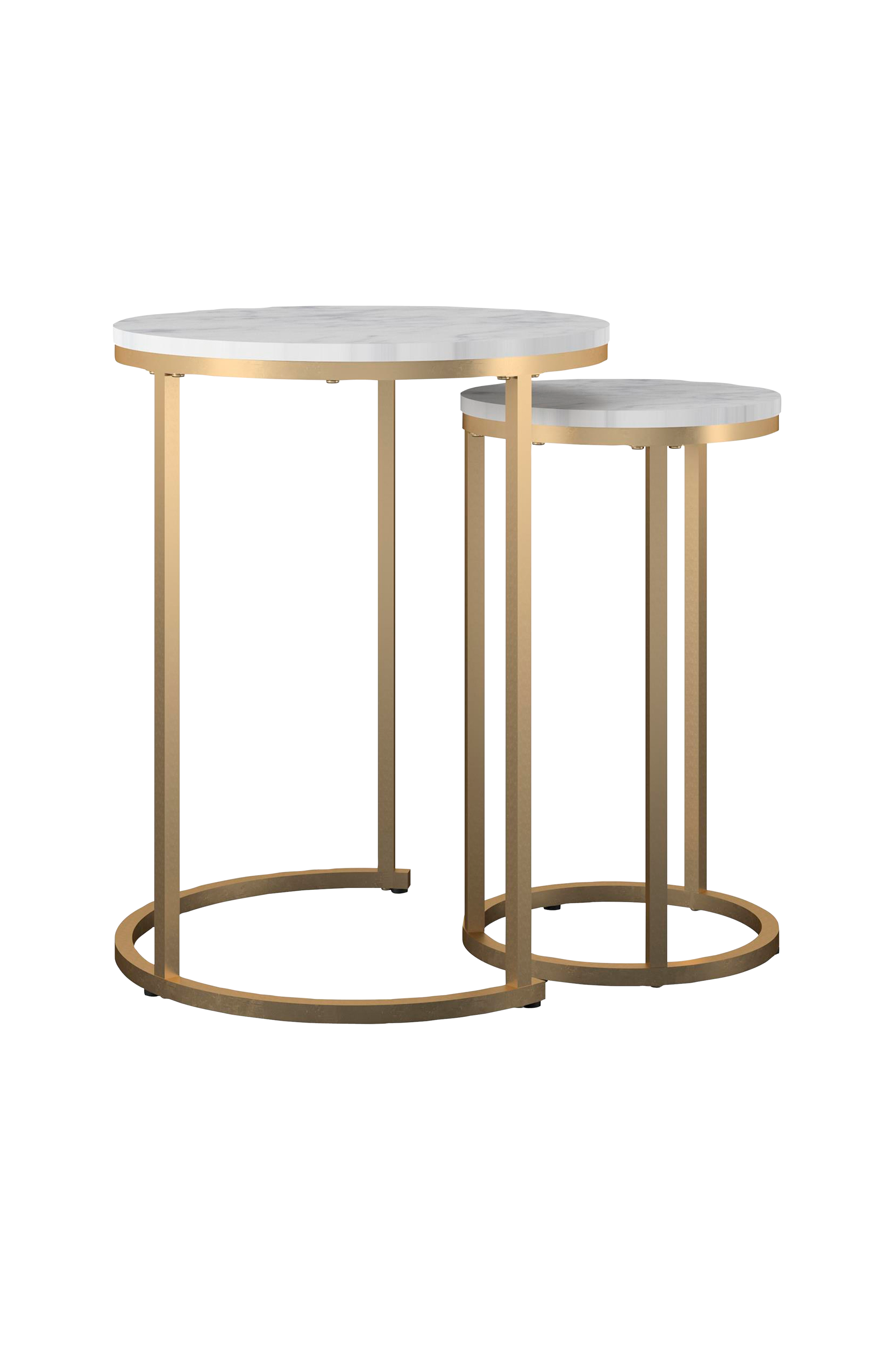 Bordene Amelia Nesting Tables fra CosmoLiving er enhver vært eller værtindes drøm. Når du har brug for ekstra bordplads, bruger du begge borde og når du har brug for ekstra gulvplads, skyder du blot det mindre bord ind under det større bord. Bordene har en elegant metalramme og en bordplade, der ligner enten hvid marmor eller terrazzo.