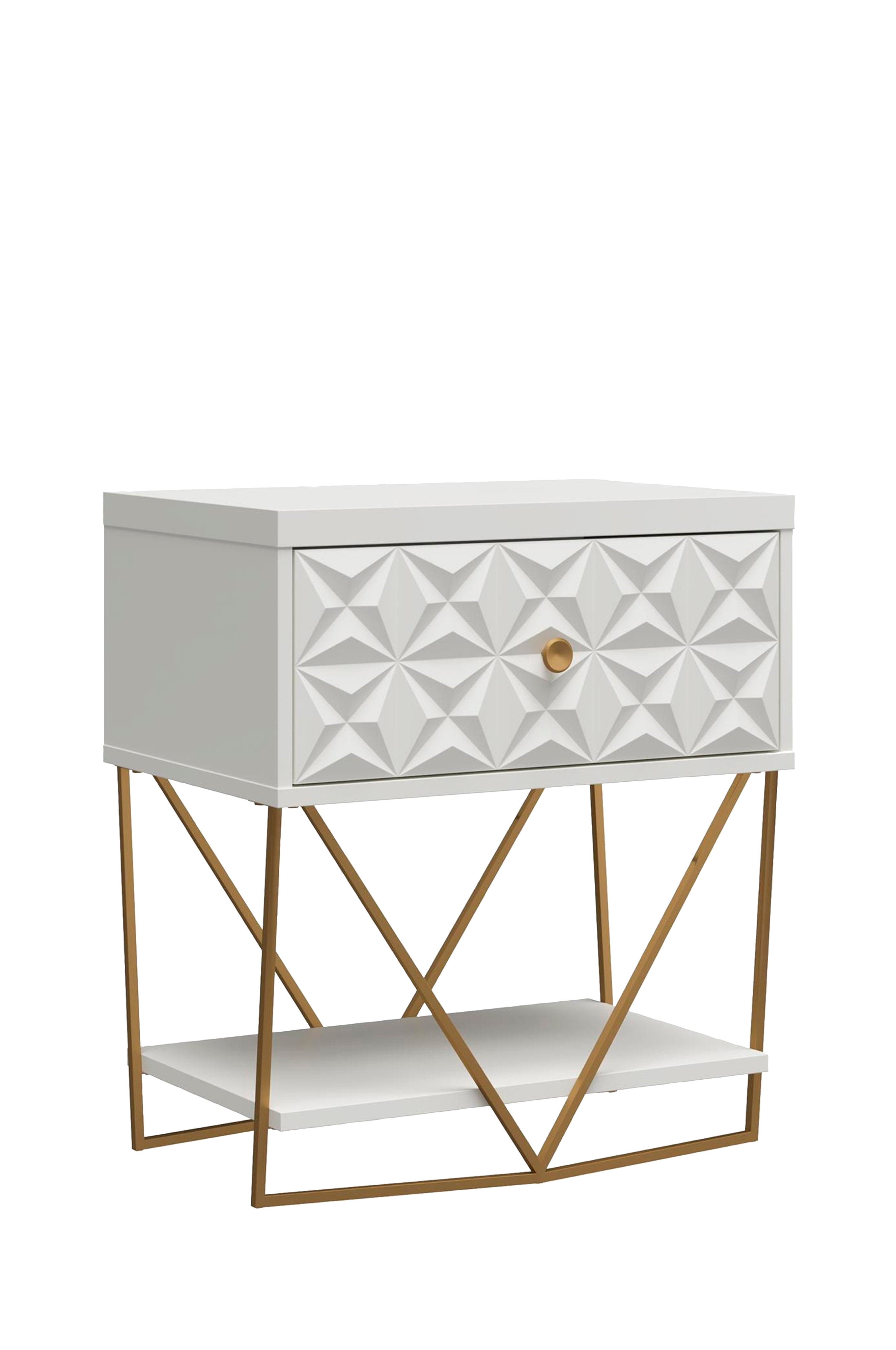 Oplev de fantastiske vinkler på sidebordet fra cosmoliving by cosmopolitan. Det har en blank, taktil 3d-struktur med glamourøse gyldne detaljer. Det er fremstillet af robust konstrueret træ og pulverlakeret jern og har en skuffe til alle dine smukke ting og en hylde nedenunder.