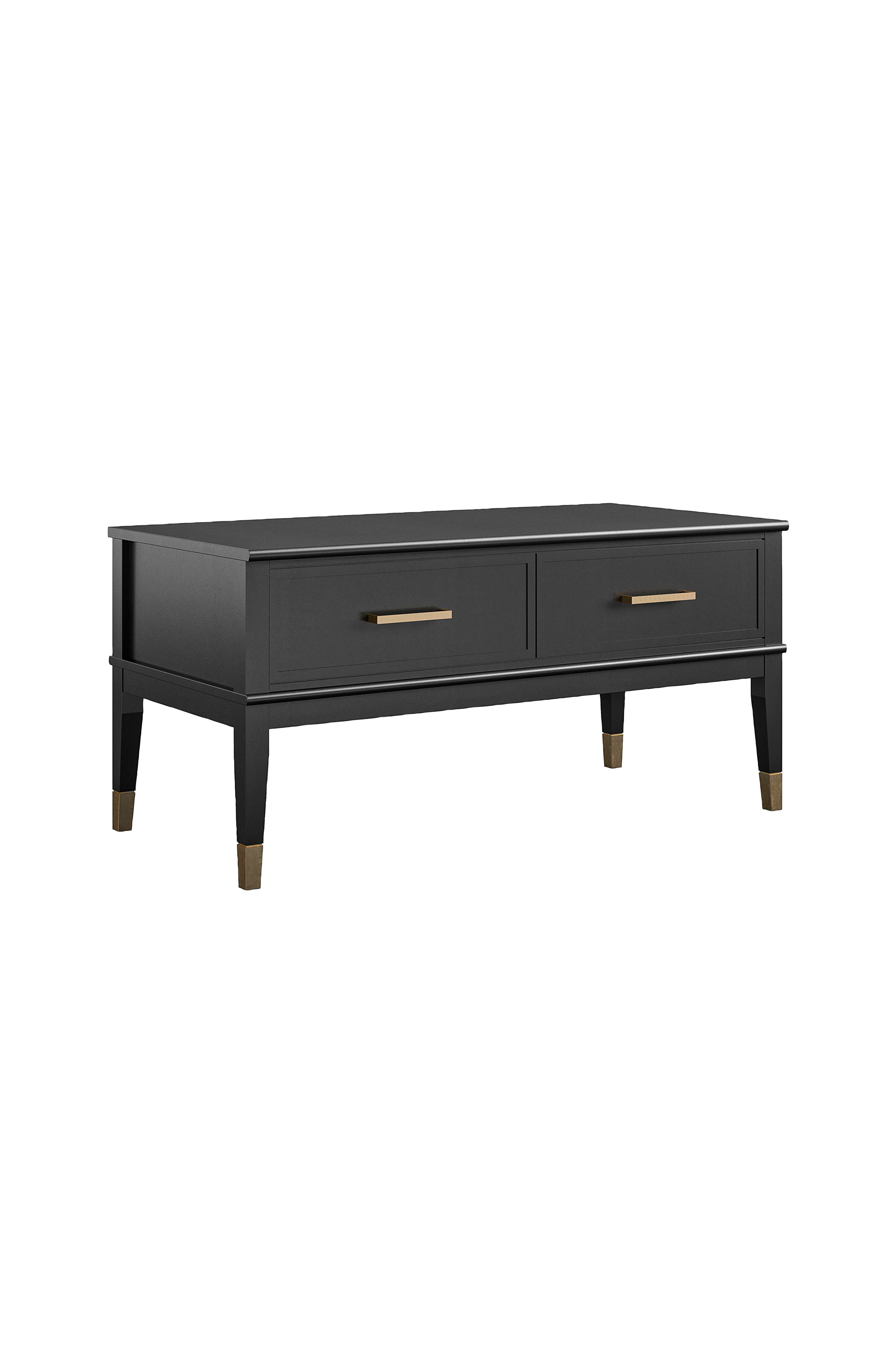 Opgrader dit hjem med Westerleigh Lift-Top Coffee Table fra CosmoLiving by Cosmopolitan. Under bordpladen er der skjult opbevaringplads! Sofabordet har trendy guldfarvede greb og fødder. Findes i hvid, grafitgrå og matsort. Perfekt til compact living!