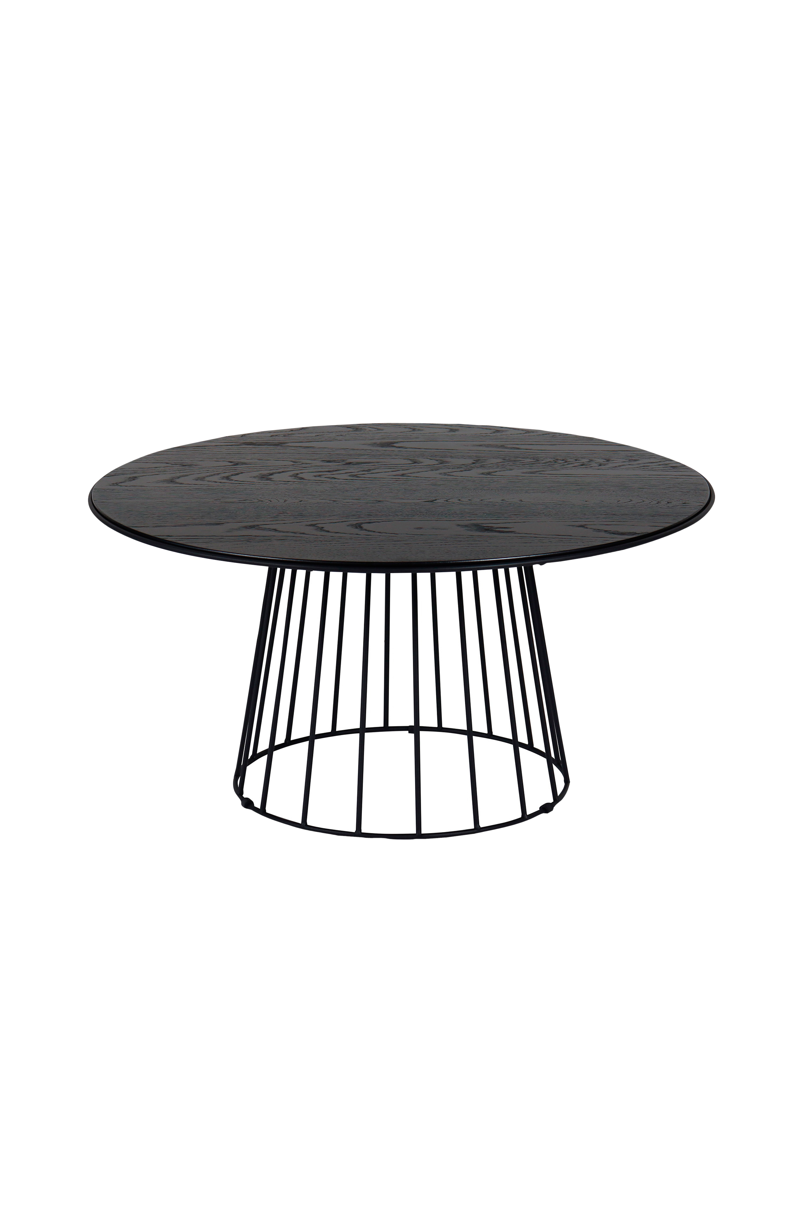 Rundt sofabord med bordplade i bejdset egefiner og stel i metal.