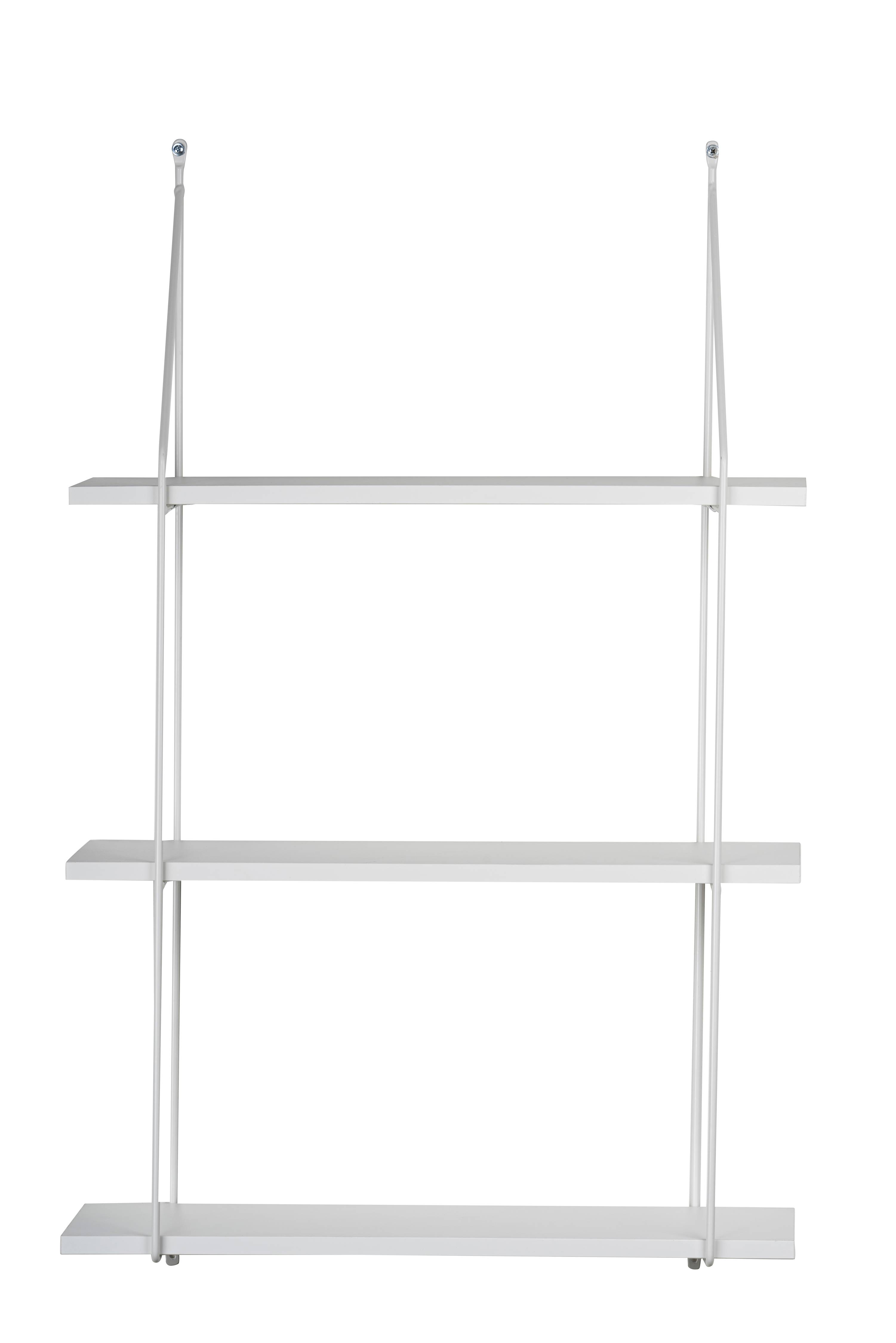 Vägghylla med 3 hyllplan i faner och konsoller i metall. Hyldeplanen går at justera i sidled. Hylden er 58 cm bred, 89 cm høj og 20 cm dyb.