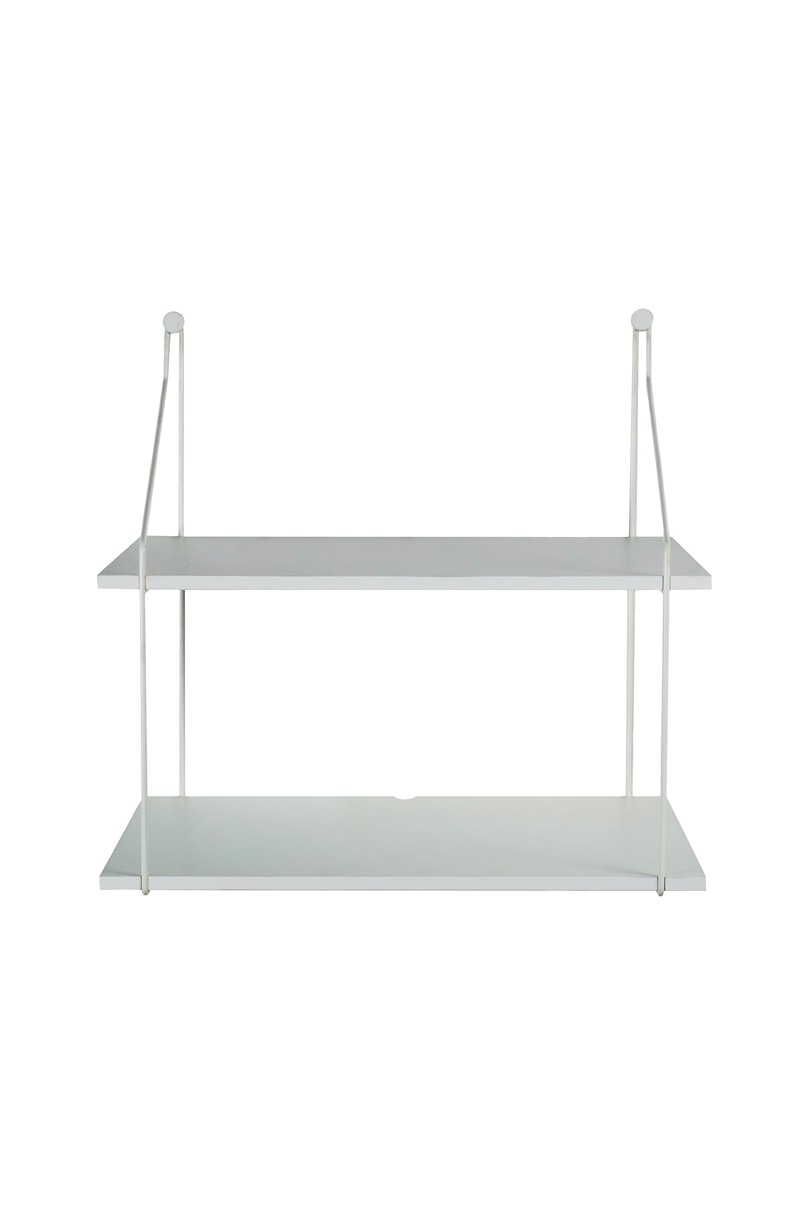 Væghylde med 2 hylder i melamin og konsol i metal, hylden er 40 cm bred, 26 cm dyb og 38 cm høj.