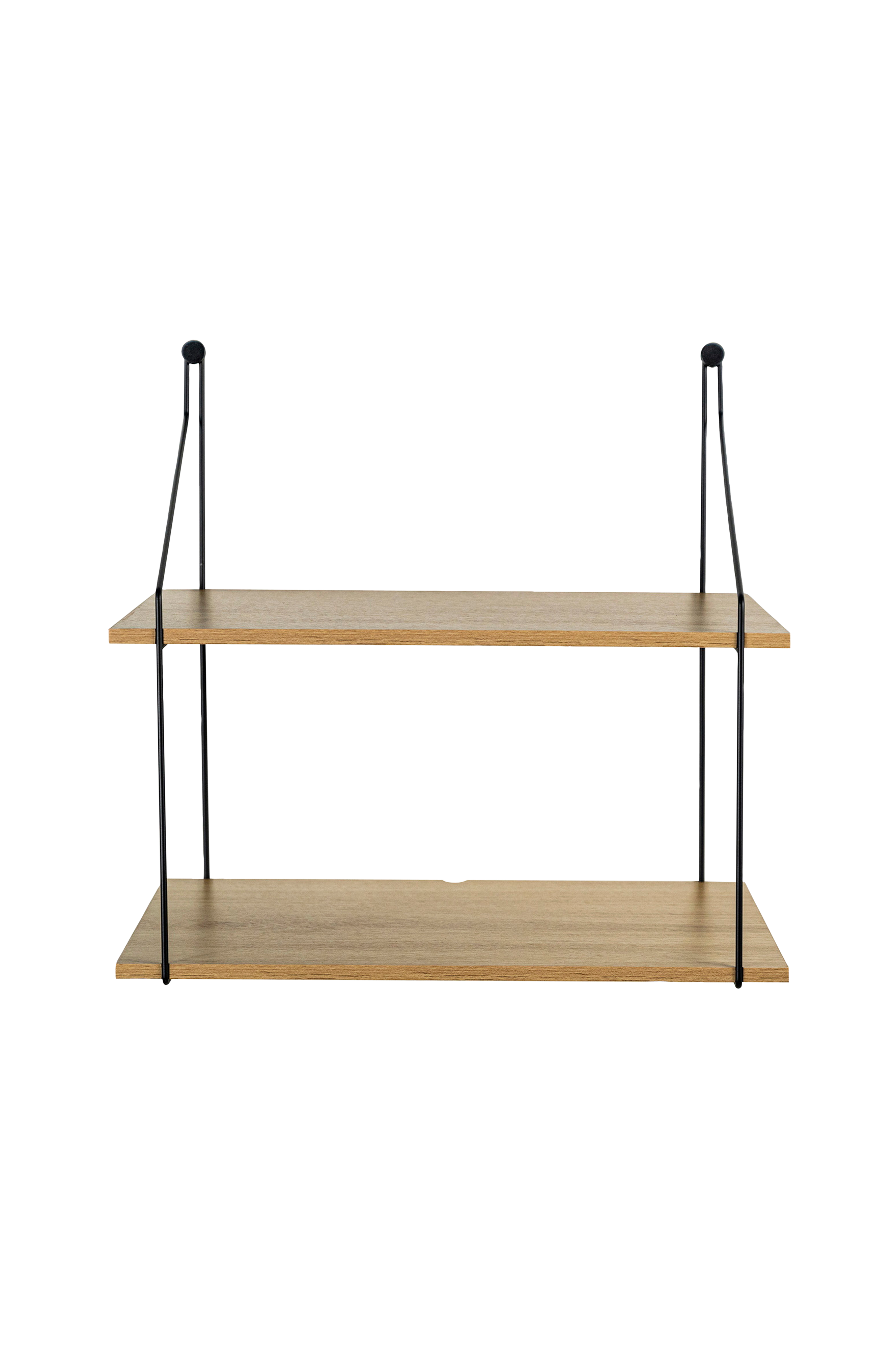Væghylde med 2 hylder i melamin og konsol i metal, hylden er 40 cm bred, 26 cm dyb og 38 cm høj.