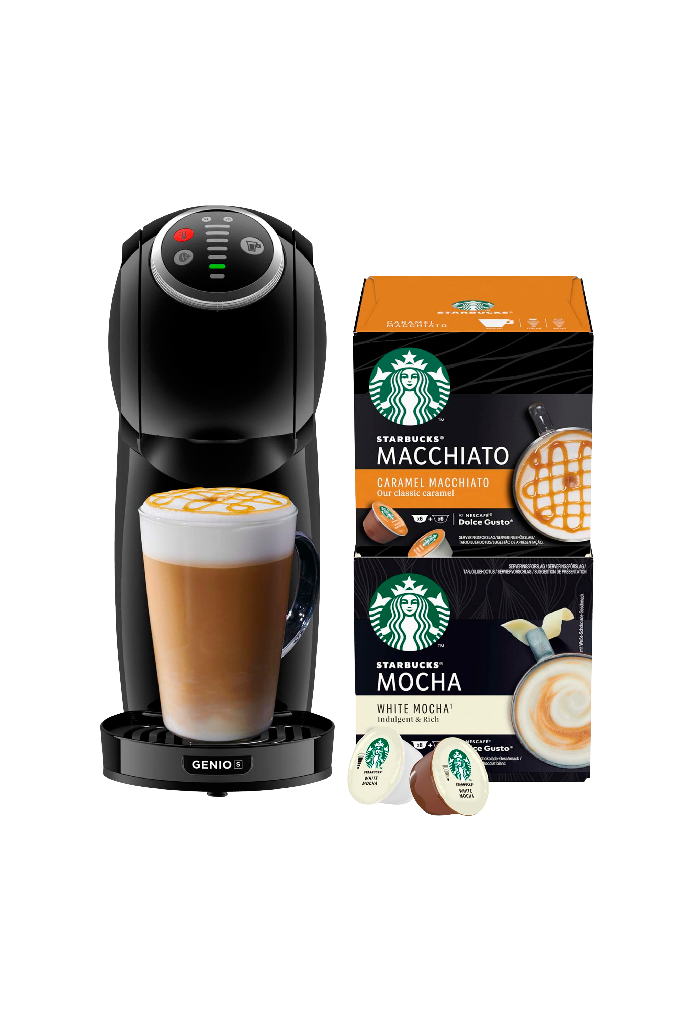 - Inkluderer Genio S Plus-maskinen + Starbucks Caramel Macchiato & White Mocha-kapsler