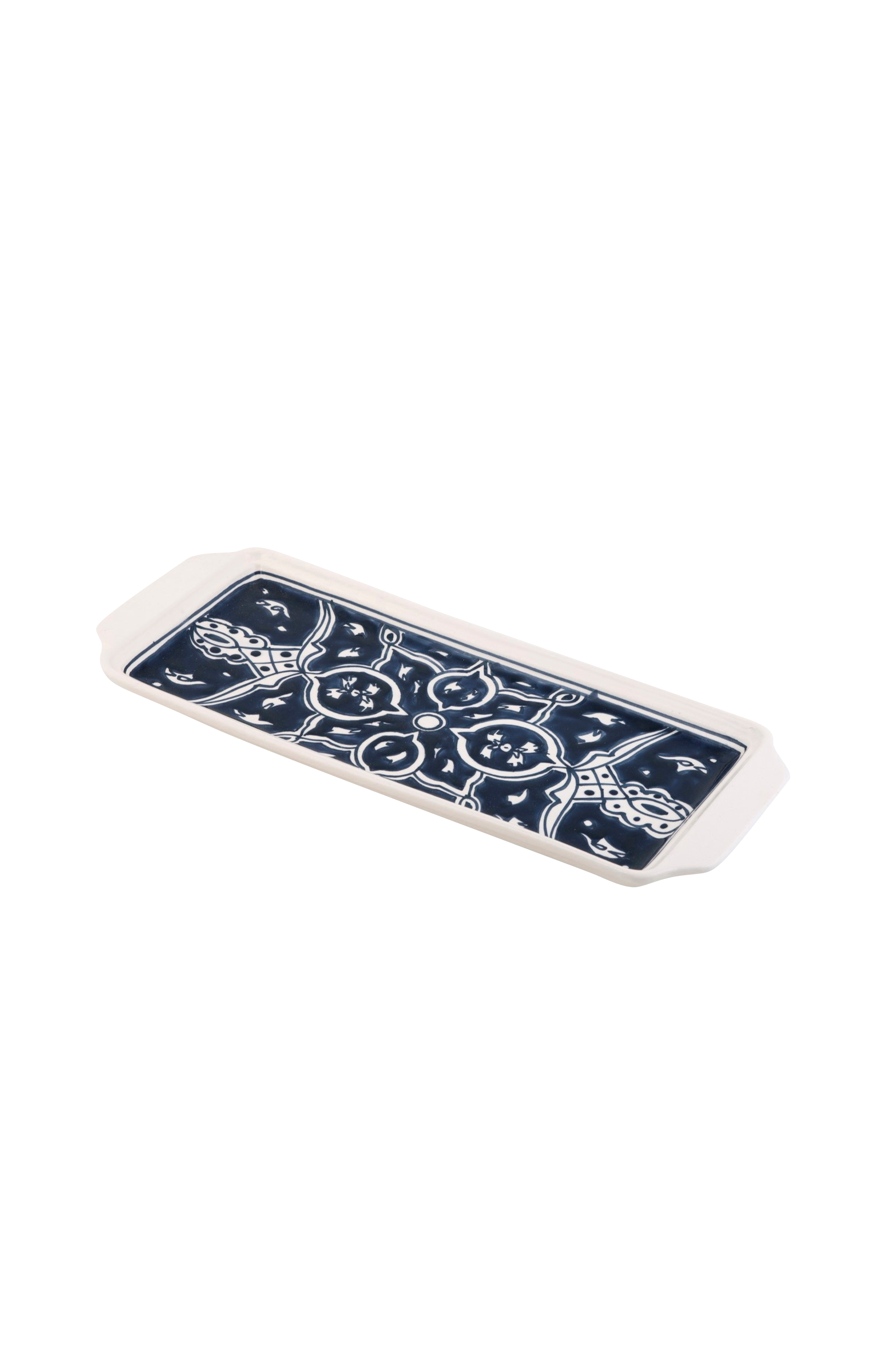 Stilfuldt rektangulært fad, der er ideelt til servering af retter som sushi, antipasti, ost og kiks eller andre appetitvækkere. Fadet er 30 cm langt og er nemt at placere på bordet eller buffeten. Dishes & deco-produkterne er håndlavede og håndmalede i Tunesien, og alle deres serveringsfade/skåle er lavet af holdbart hvidt stentøjsler. Tåler ovn, mikroovn og opvaskemaskine.