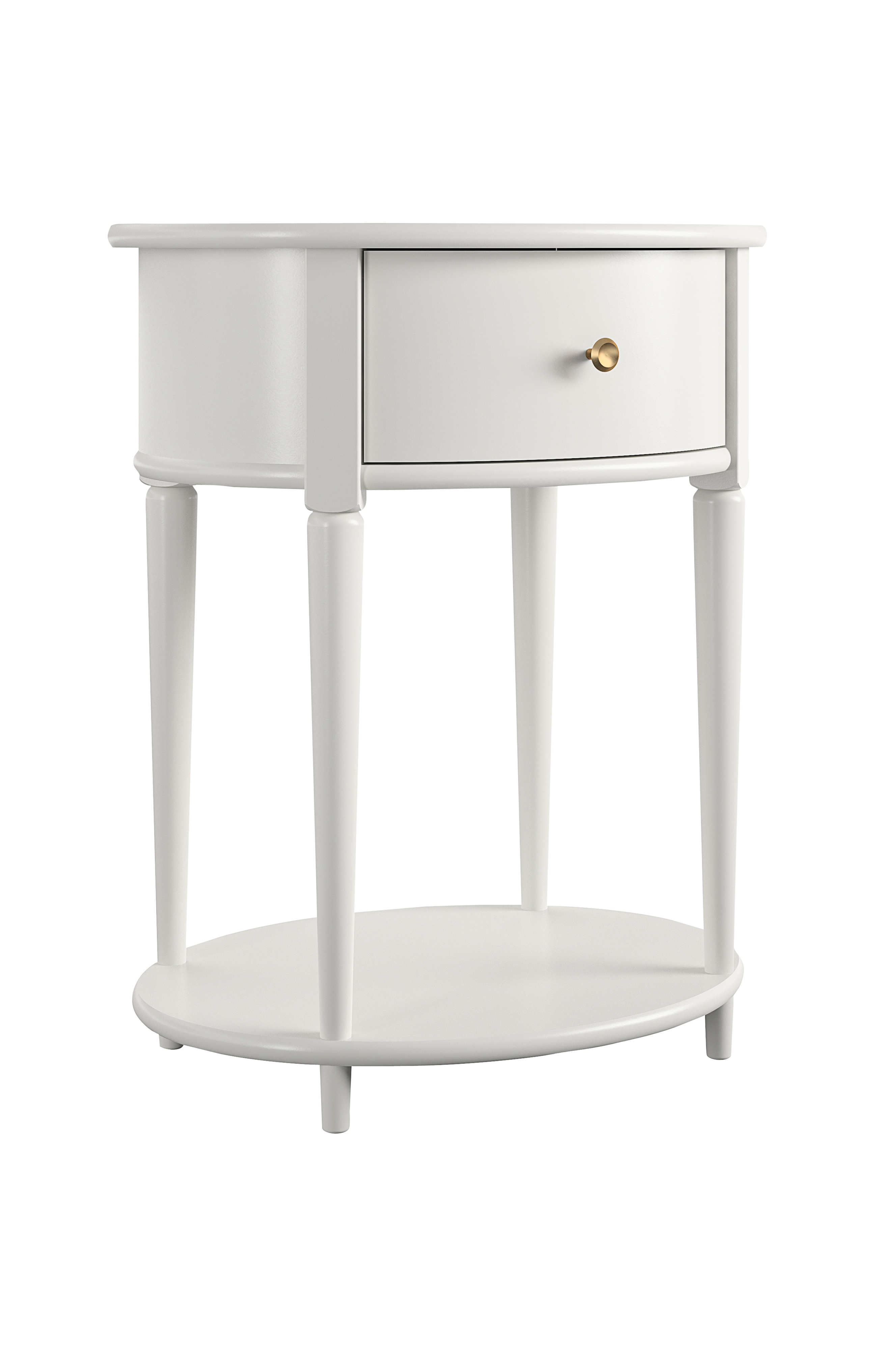 Det elegante sidebord har en rummelig skuffe til opbevaring af fjernbetjeninger, bordskånere eller andet rod, og den nederste hylde er perfekt til bøger, magasiner eller endda pyntegenstande, der kan gøre rummet mere hyggeligt. På grund af det charmerende runde design og opbevaringen er aurora også et smukt sengebord! Endebordet aurora er lavet af krydsfiner og malet mdf og er lige så holdbart, som det er prisvenligt, og det er nemt at samle! Bordpladen og skuffen er færdigsamlet og klar til brug lige ud af æsken, så det er bare at sætte benene og den nederste hylde på.