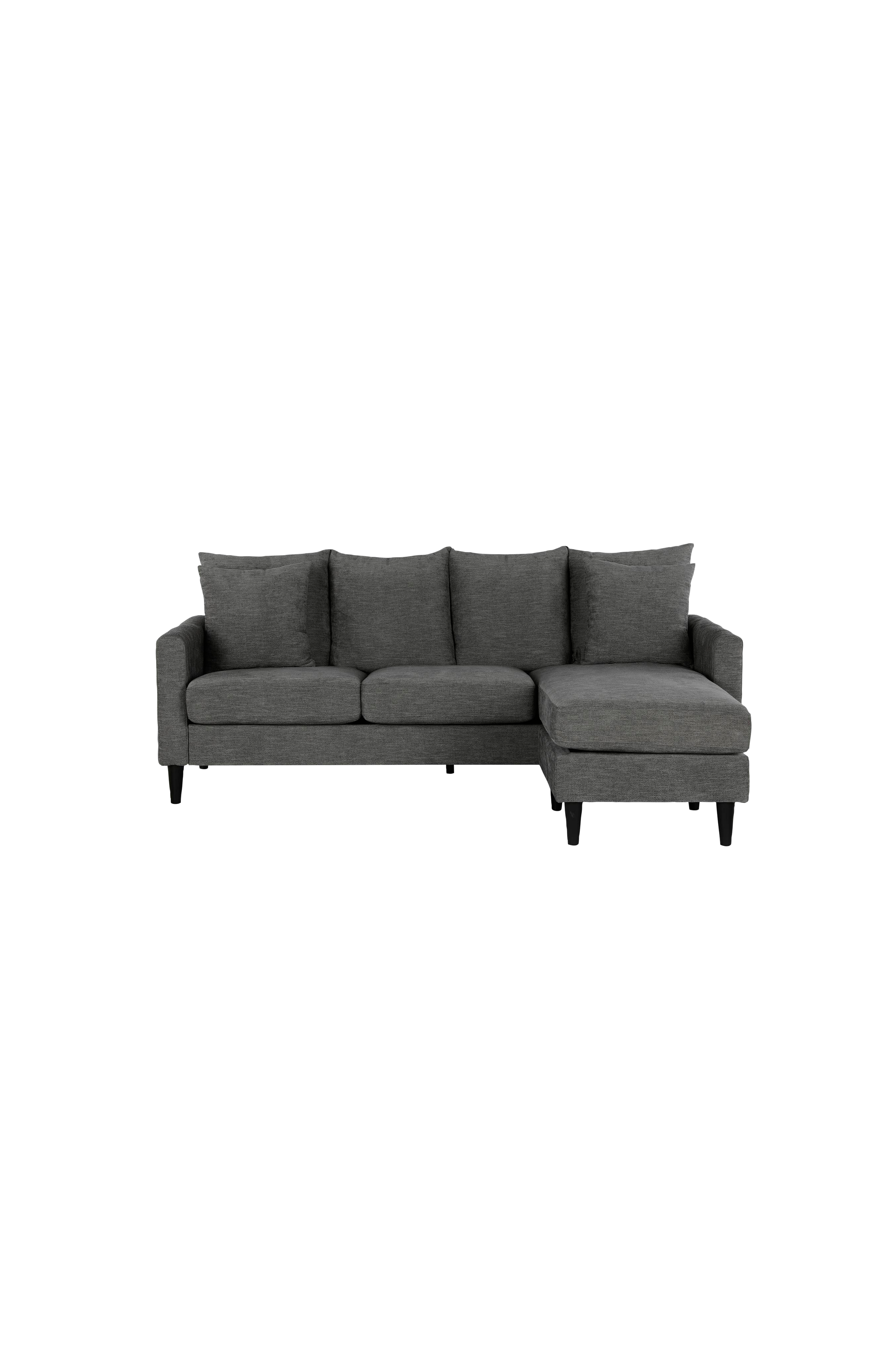 Den vendbare modulsofa med puder Forbin fra DHP, der er designet med en afslappet, sofistikeret og indbydende stil, inkarnerer komfortabel, justerbar komfort med et friskt, moderne udtryk. Forbin er den perfekte løsning til mindre rum, hvis du ønsker alsidige siddepladser uden at gå på kompromis med komfort eller stil. Betrukket med et let tekstureret gråt stof, der er slidstærkt og let at rengøre, giver den en justerbar løsning med en løs skammel, der gør det muligt at placere chaiselongen på venstre eller højre side af sofaen, så den passer til dit hjems indretning. Med en indbydende, hyggelig stil har Forbin modulsofaen bløde rygpuder med to lækre og behagelige puder og løse sædehynder, der gør sofaen behagelig og nem at rengøre. Den vendbare modulsofa med puder Forbin fra DHP har robuste, tilspidsede ben med en kontrasterende sort finish og er en rummelig, afslappet og justerbar løsning, der er perfekt til mindre rum.