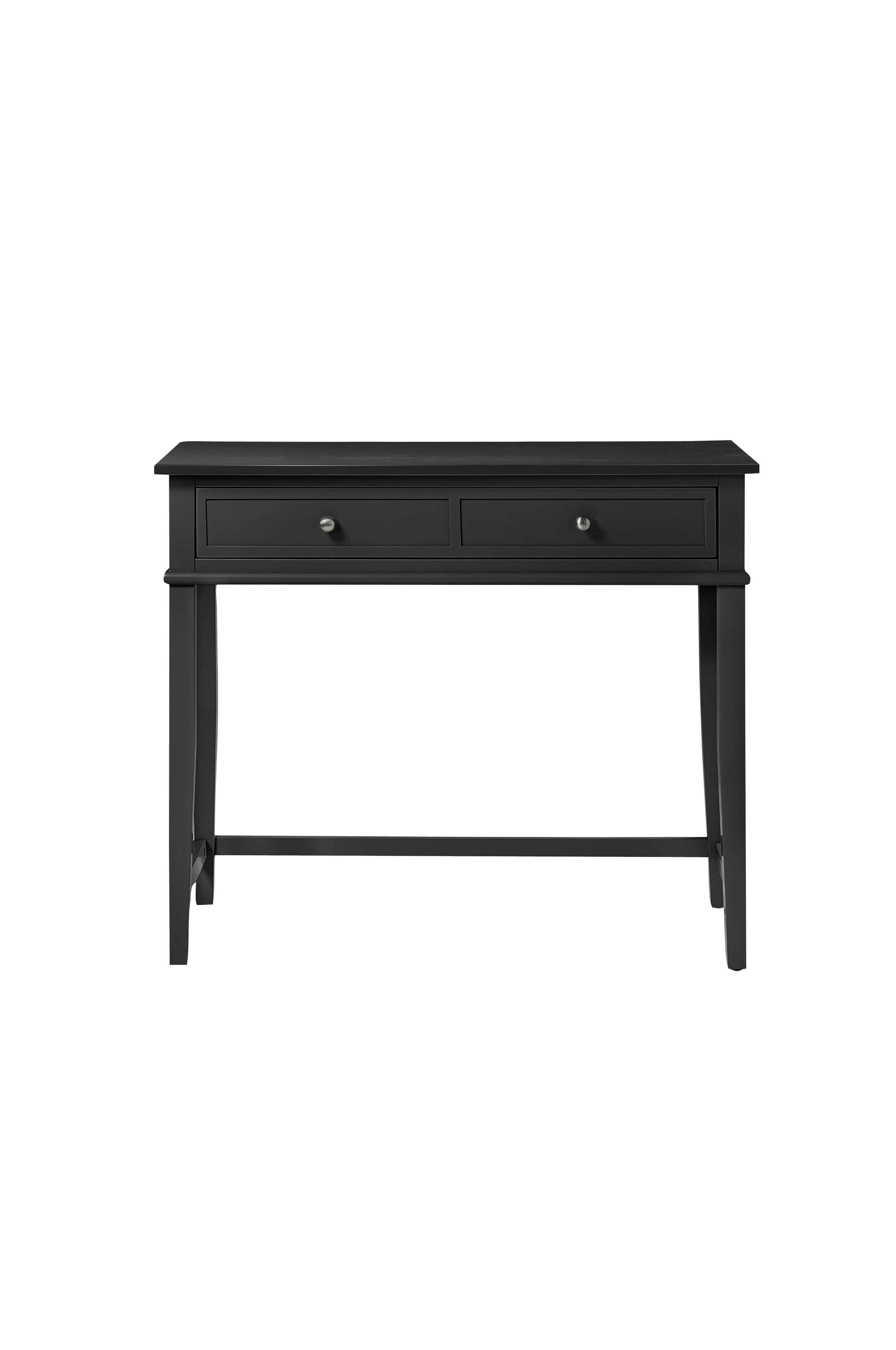 Med skrivebord Franklin Writing Desk får du den arbejdsflade og opbevaring som du skal bruge for at arbejde. Det stabile skrivebord er fremstillet af MDF og har ben i massiv træ. De dekorative kantlister og de tilspidsede ben skaber et elegant look som opgraderer dit dagligstue eller hjemmekontoret i et snuptag. Arbejdsområdet har plads til en bærbar computer, notesbog og familiebilleder. Den store skuffe har sølvfarvede knopper og er indrammet så det ligner to skuffer. Den har plads til både papir og kontorartikler. Du skaber et samlet look ved at indrette rummet med andre møbler i Franklin-kollektionen (sælges separat). Skrivebordet leveres i en flad pakke og skal samles. Vi anbefaler, at to voksne samler produktet.