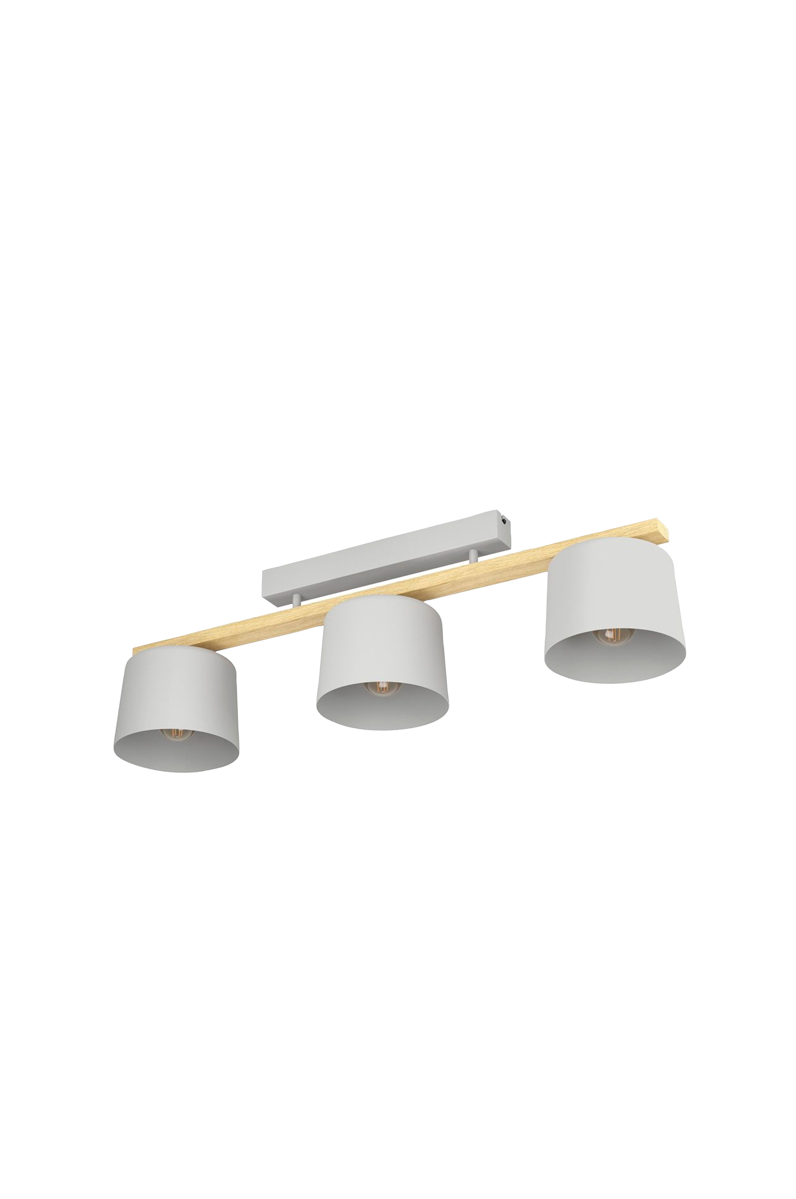 mariel loftslampen har et langt brunt træelement med tre runde stofskærme i lysegrå, der er fastgjort til et loftsbeslag i lysegråt metal. Loftslampen passer perfekt ind i moderne indretning og giver på grund af blandingen af træ- og stofmaterialer en hyggelig belysning i stuen, soveværelset eller gangen. Pærer medfølger ikke. Produktet har e27-lampeholdere og kræver e27-pærer.