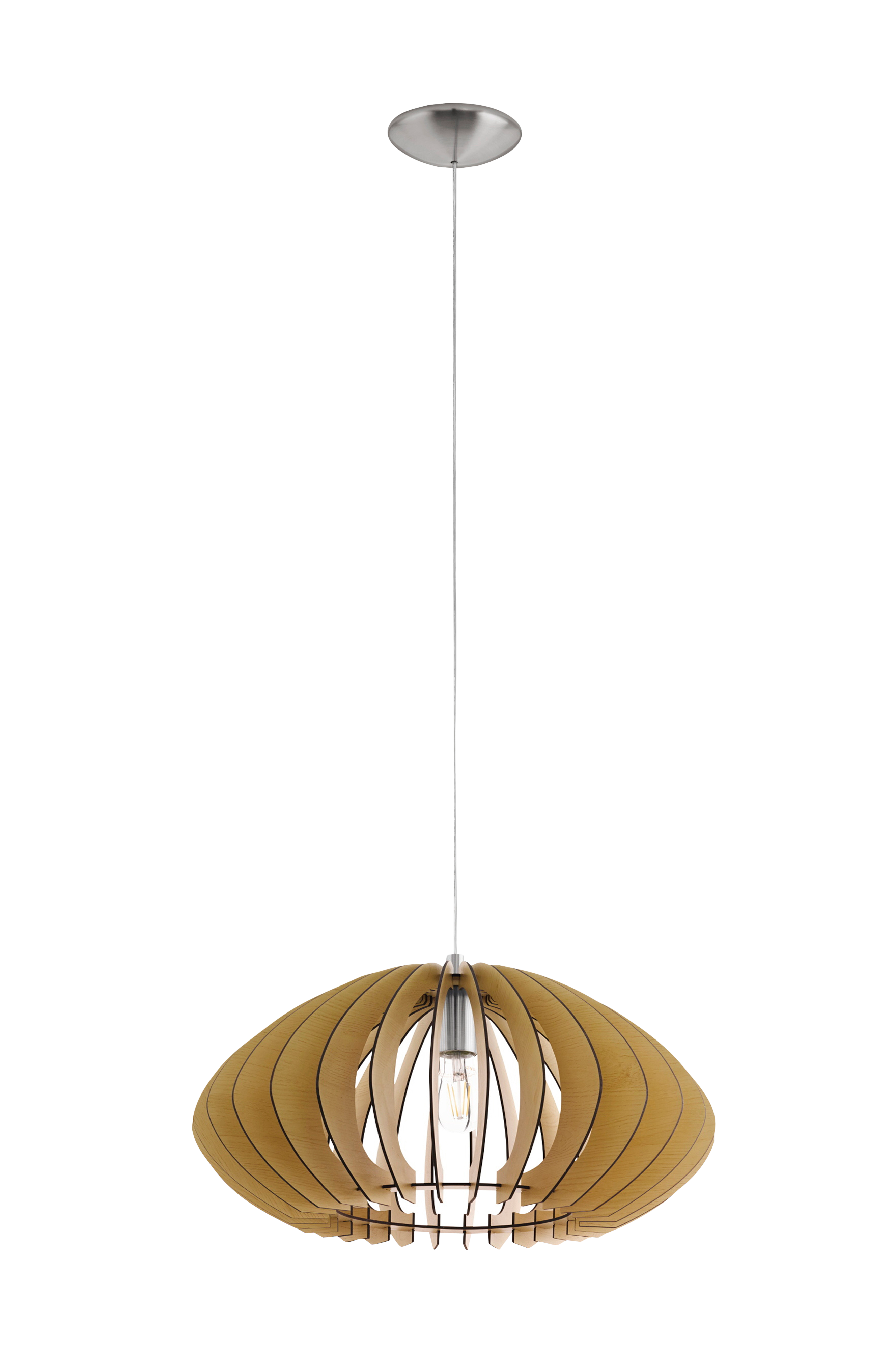 cossano 2-pendlen har en afrundet lampeskærm lavet af ahornfarvede eller brune trælameller, der hænger på en baldakin af mat nikkelmetal. Trælamellerne skaber et fascinerende lys- og skyggespil, når lyset er tændt. Med en diameter på 50 cm passer pendlen perfekt ind i moderne indretningsstile og giver en indbydende belysning i stuen eller over bordet i spisestuen. Den afbildede glødepære er ikke inkluderet. Produktet har en e27-lampeholder og kræver en e27-pære.
