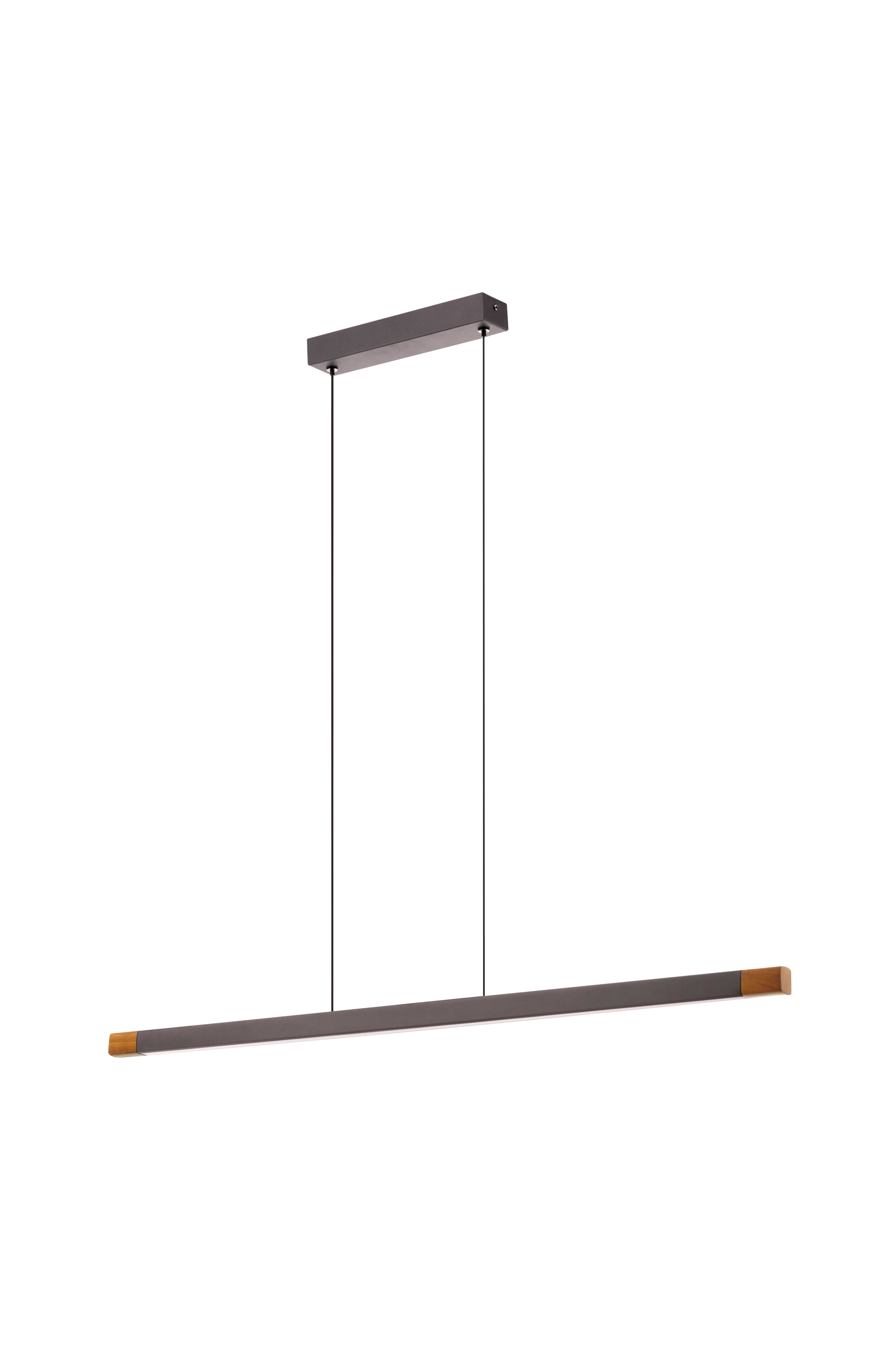 lisciana -pendlen har en nedhængt aluminiumsprofil i mørkebrun finish med detaljer i gummitræ i valnøddefinish. Lampens moderne look suppleres af de sorte tekstilkabler og metalbaldakinen. De integrerede lysdioder bag det matte, hvide plastpanel kan dæmpes med en matchende drejedæmper på væggen og giver et behageligt, varmt hvidt lys. Med sit lineære design og en længde på 87,5 cm giver pendlen en ideel belysning over spisebordet.