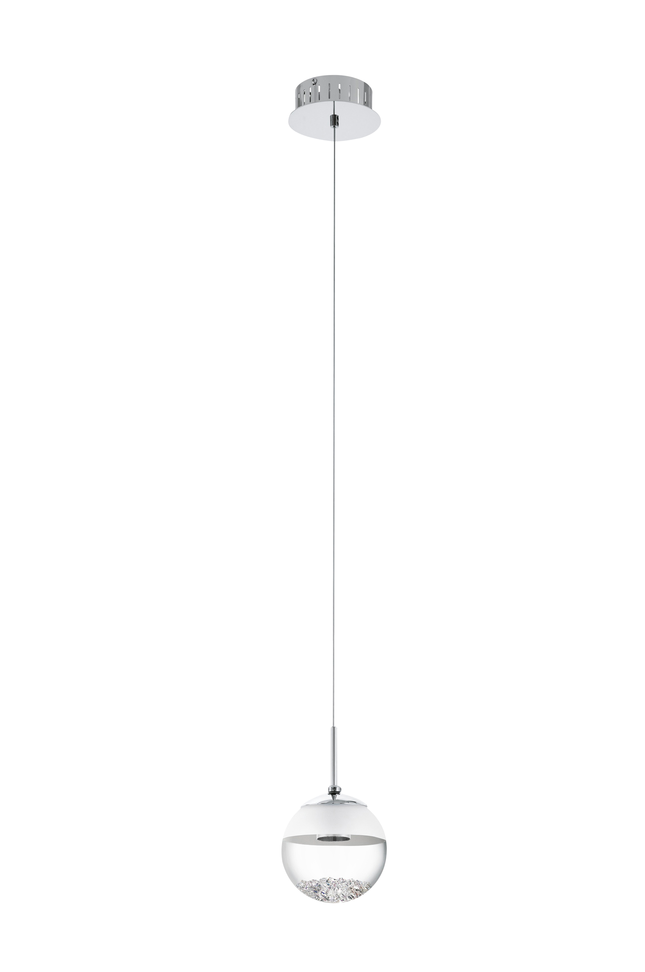 montefio 1 led-pendlen har en kugleformet lysskærm af klart og satineret glas med indvendige brillanter og krystaller. Pendlen er ophængt i en kromfarvet, rund stålbaldakin. De integrerede lysdioder giver et behageligt varmt hvidt lys og skaber en elegant og funklende effekt, når de skinner gennem de brillante krystalglaselementer af høj kvalitet. Pendlen supplerer moderne interiørdesign og giver en karakteristisk belysning i stuen eller over spisebordet.