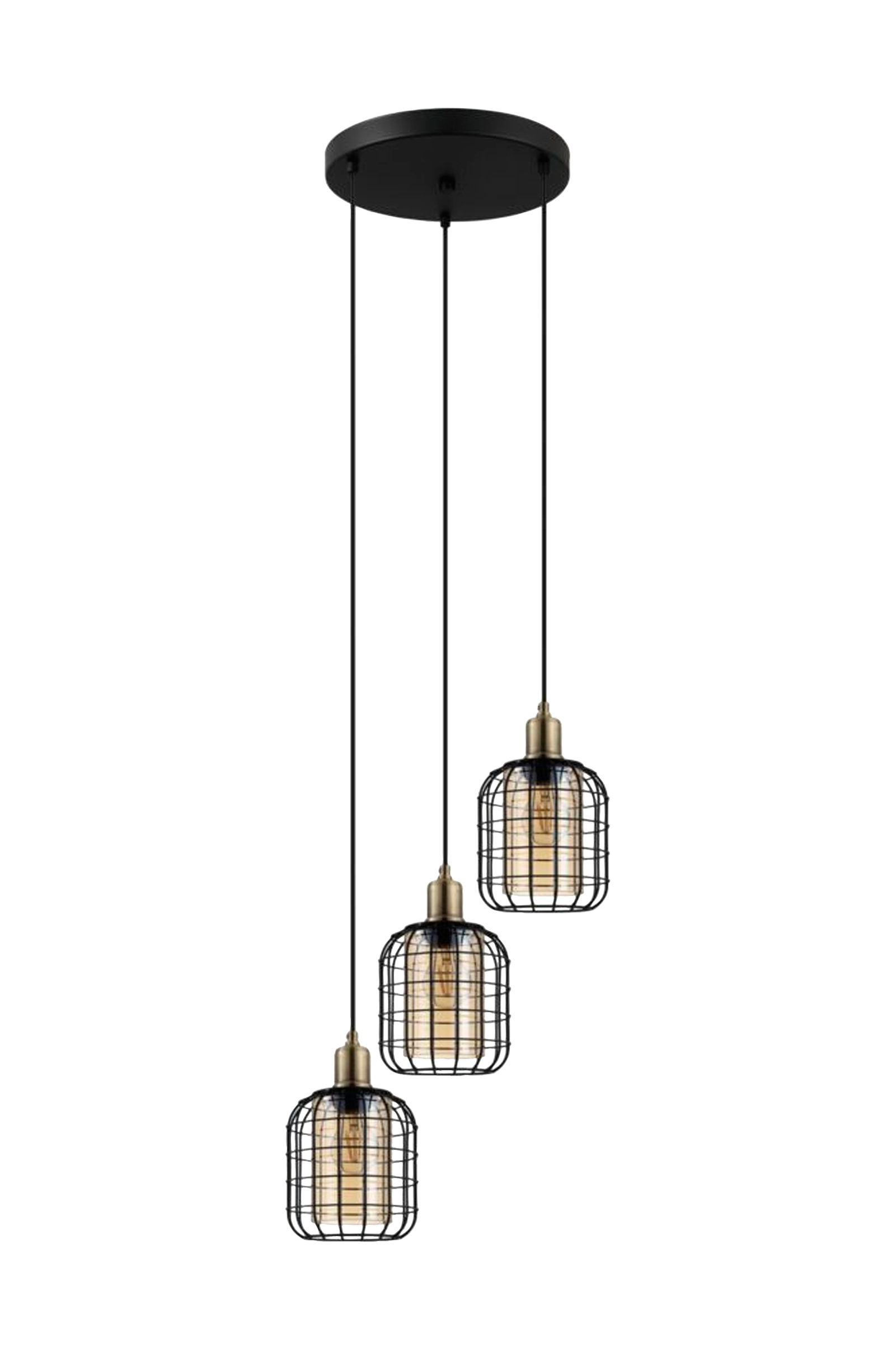 chisle pendlen har tre black lampeskærme af tråd with amber -belagte inderskærme af glas. Hver skærm er ophængt i forskellig højde fra black metalbaldakinen. Når lyset er tændt, skaber det indhegnede design et fascinerende spil af lys og skygge, når det belyses. Kombinationen af elegant glas og rustikt metal supplerer moderne interiør i loftstil. Produktet skaber effektfuld belysning i ethvert rum, uanset om det er i stuen eller over spisebordet. Produktet kræver 3 x e27-pærer, som ikke medfølger.