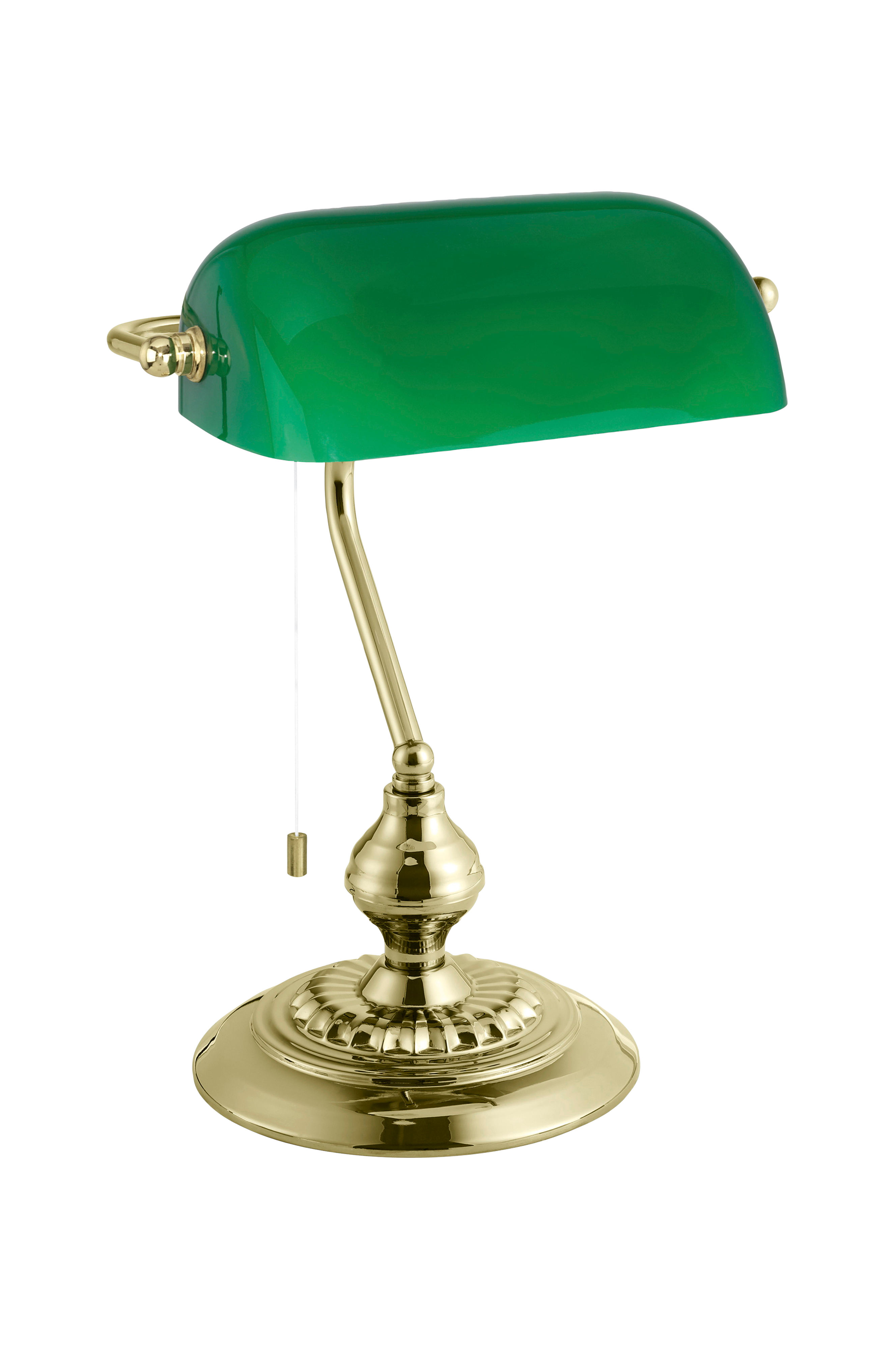 banker bordlampen har en dekorativ messingfarvet metalfod og en drejelig lampeskærm af malet glas i en finish med en hvid indvendig overflade. Med sit typiske art deco-design vil bordlampen skabe blikfang i ethvert opholdsrum. banker -lampen kan nemt tændes og slukkes ved hjælp af en trækkontakt på hovedet. Den giver stilfuld belysning i soveværelset, stuen eller gangen, men fungerer især godt som skrivebordslampe på kontoret. Pæren medfølger ikke. Produktet har en e27-lampeholder og kræver en e27-pære.