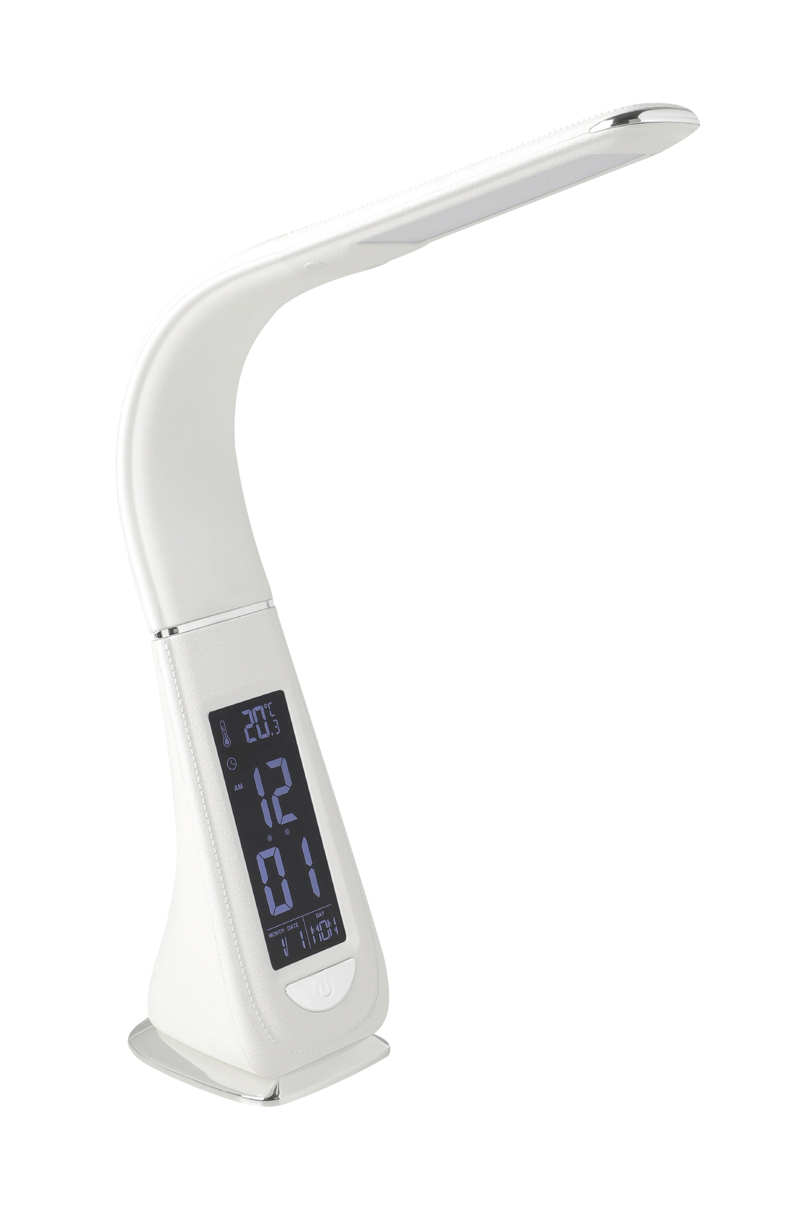 cognoli led-skrivebordslampen er fremstillet af sort eller hvid plast med kromfarvede detaljer. De integrerede lysdioder giver et neutralt hvidt lys, som er ideelt, når man arbejder. På grund af den fleksible hals kan produktet straks give fokuseret belysning til dit arbejdsområde. Skrivebordslampen har en tretrins berøringsdæmper. Ud over at vise klokkeslæt, temperatur og dato har lampen en alarmfunktion med forskellige lyde. Med sit moderne look og attraktive plastikdetaljer, der minder om lædersømme, vil denne lampe helt sikkert være et praktisk og dekorativt must-have til din arbejdsplads, uanset om det er på skrivebordet på kontoret eller hjemmekontoret.