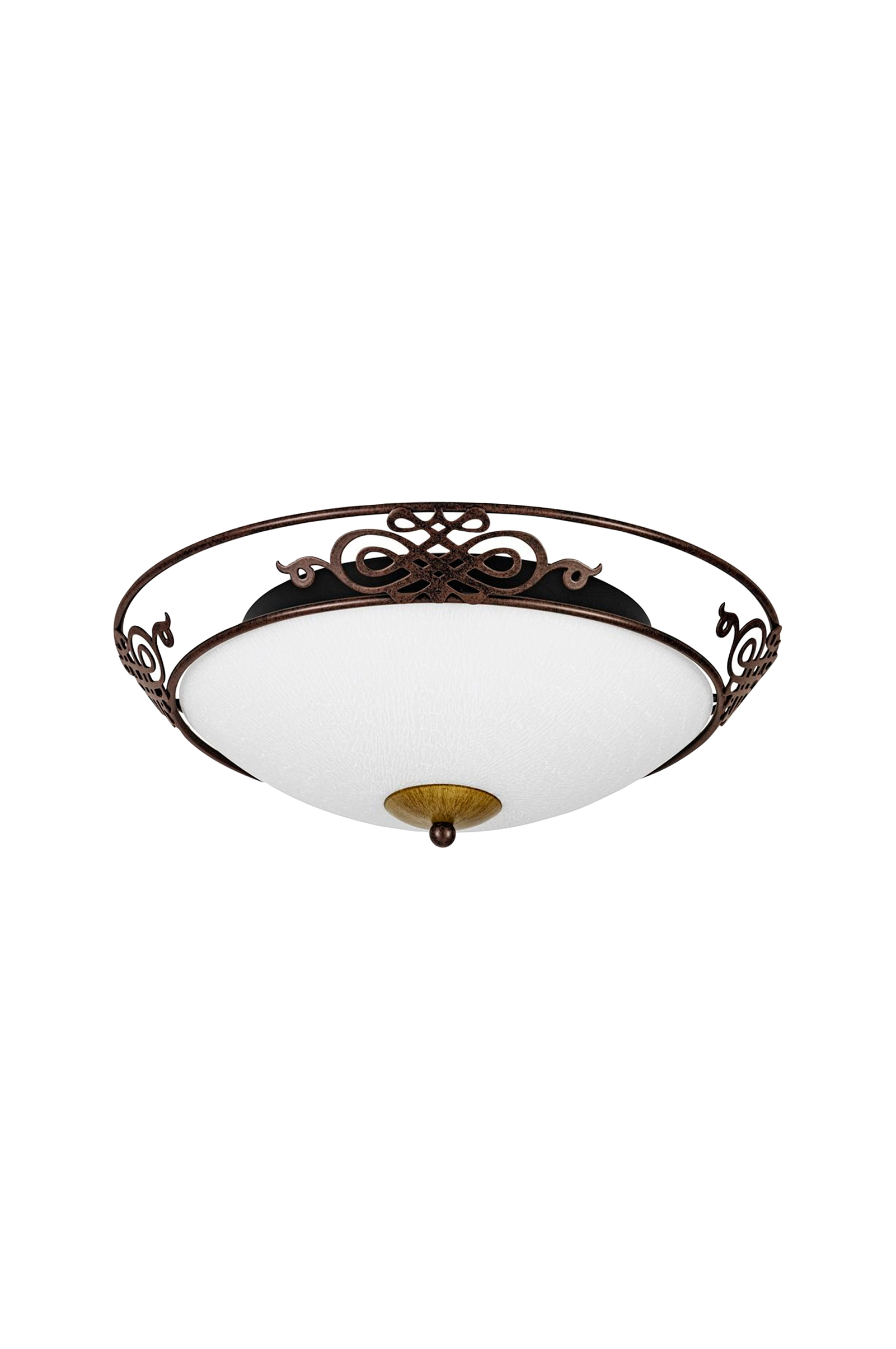 Den har et klassisk design med kalket glas og en indfatning af stål i antikbrune og guldfarvede nuancer.