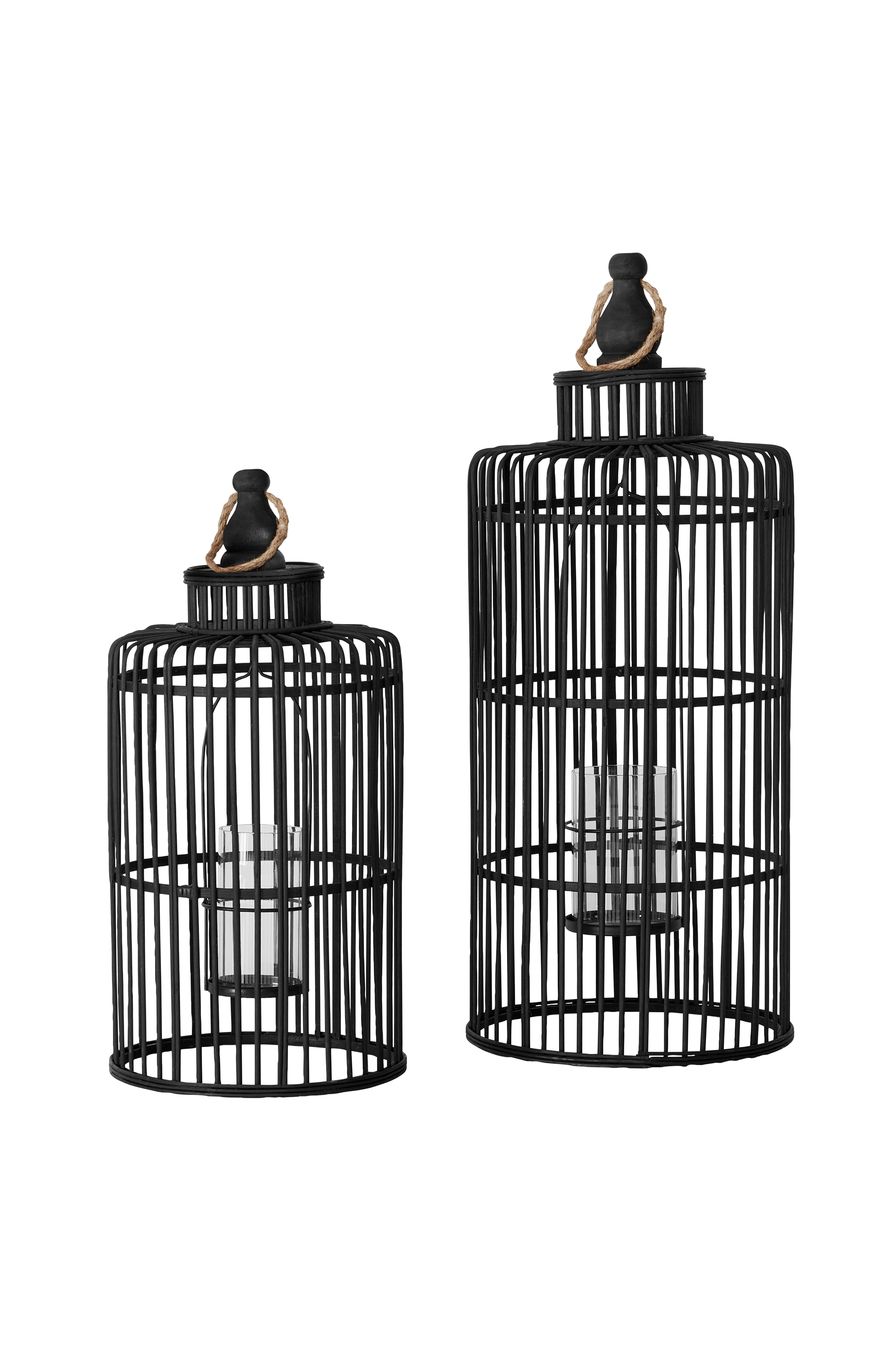 Sæt med 2 lanterner i træ. Lanterner i metal med en glascylinder. Højde 74 cm og 55 cm. Tørres med en tør klud.