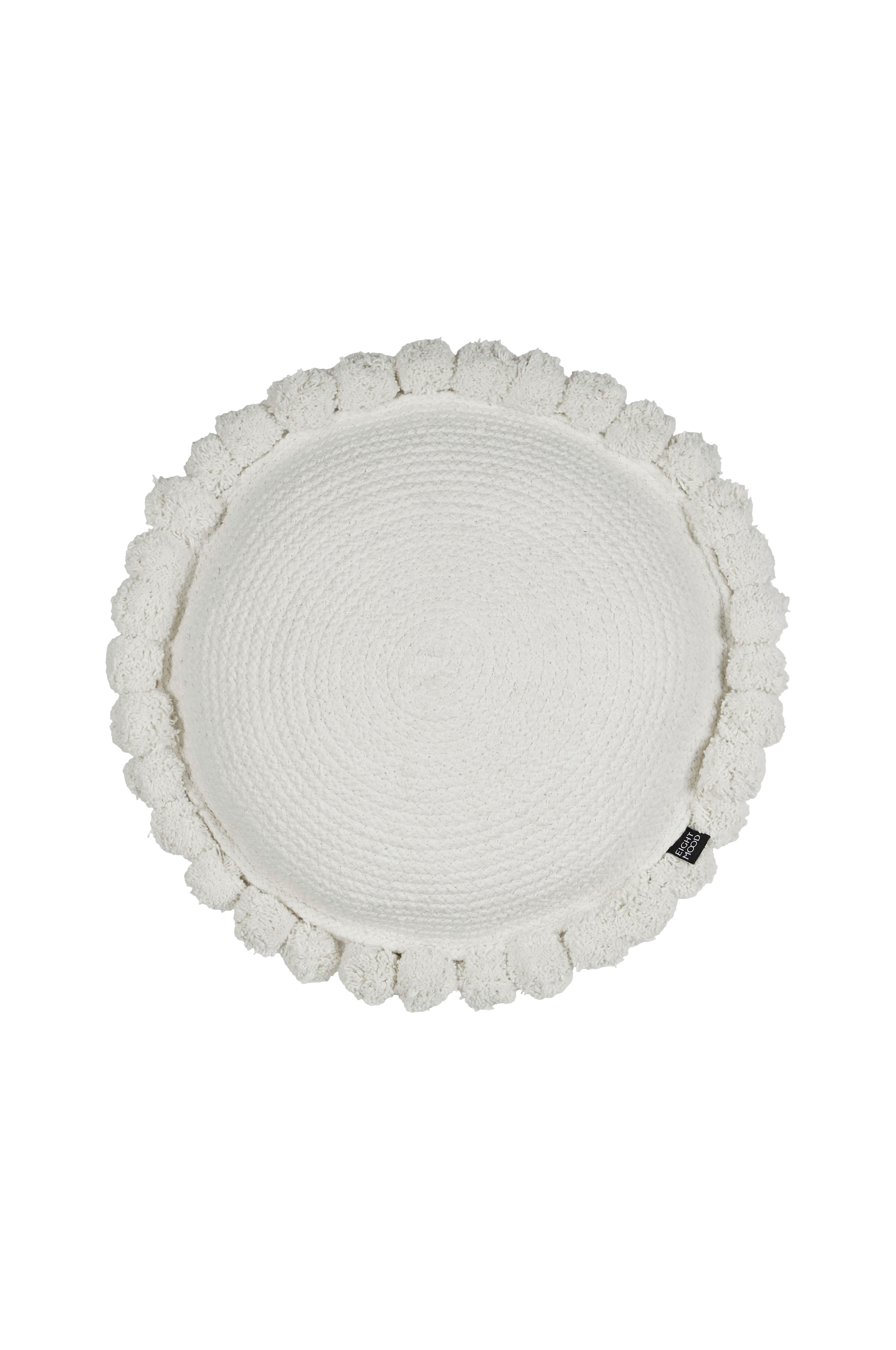 Fyldt håndlavet pude med flettede detaljer og dekorative kugler hele vejen rundt. Mål dia. 40 cm. Spotclean.