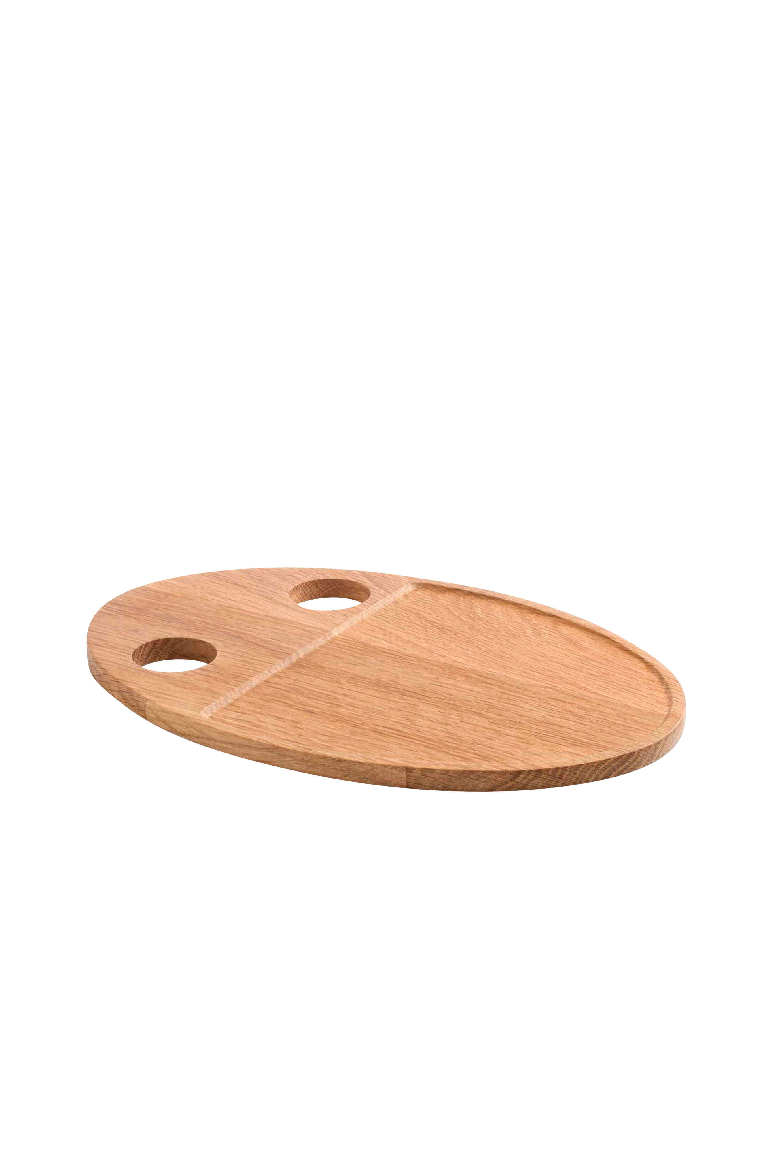 Serve me-bakken er et stilrent ovalt serveringsbræt lavet af olieret eg med en konkav overflade og to runde udskæringer til et krus og en skål eller et æg. Mål: længde 26 cm, bredde 17,5 cm, højde 1,0 cm. Materiale: eg.