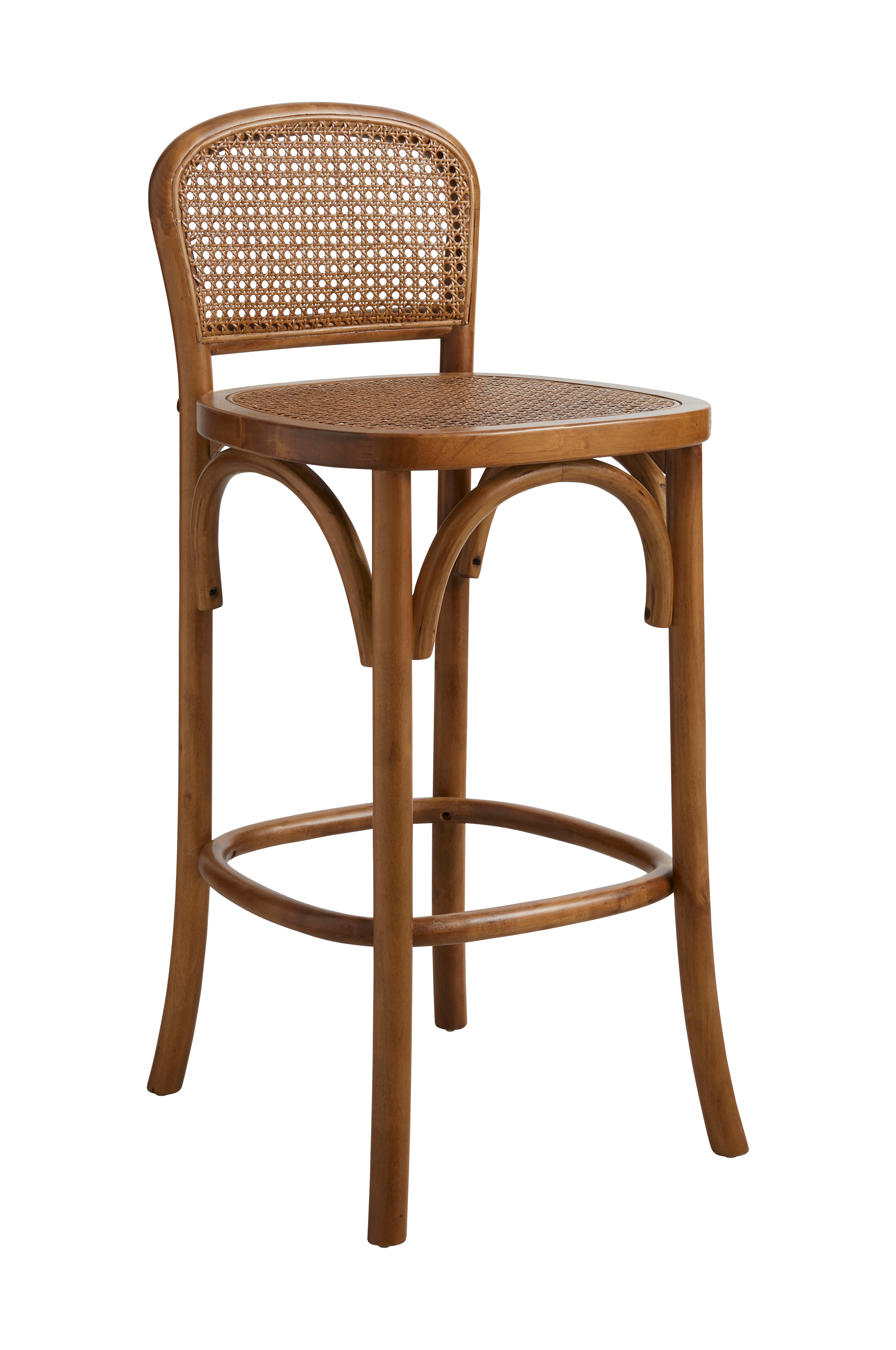 Barstol i birk med ryg og sæde af rotting. Højde 91 cm, dybde 42 cm, bredde 40 cm. Siddehøjde 67 og siddedybde 39 cm. Samlet.