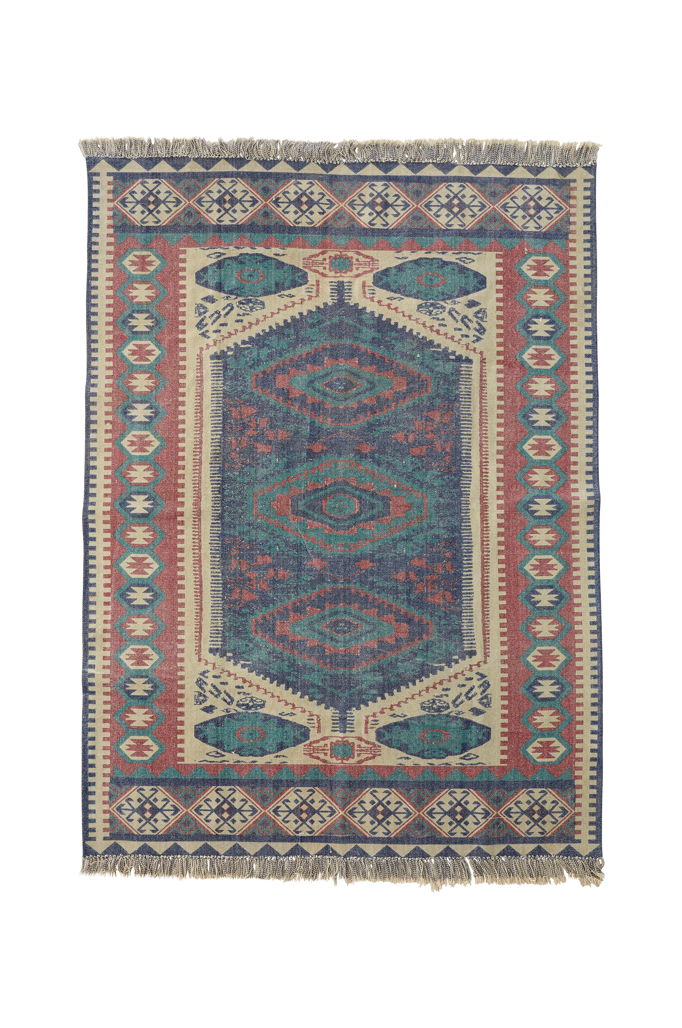 Vævet bomuldstæppe i vasket kvalitet med printet mønster. Frynser langs kortsiderne. Frynserne er også mønstrede. Tæppet findes i to størrelser, 140x200 og 170x240 cm.