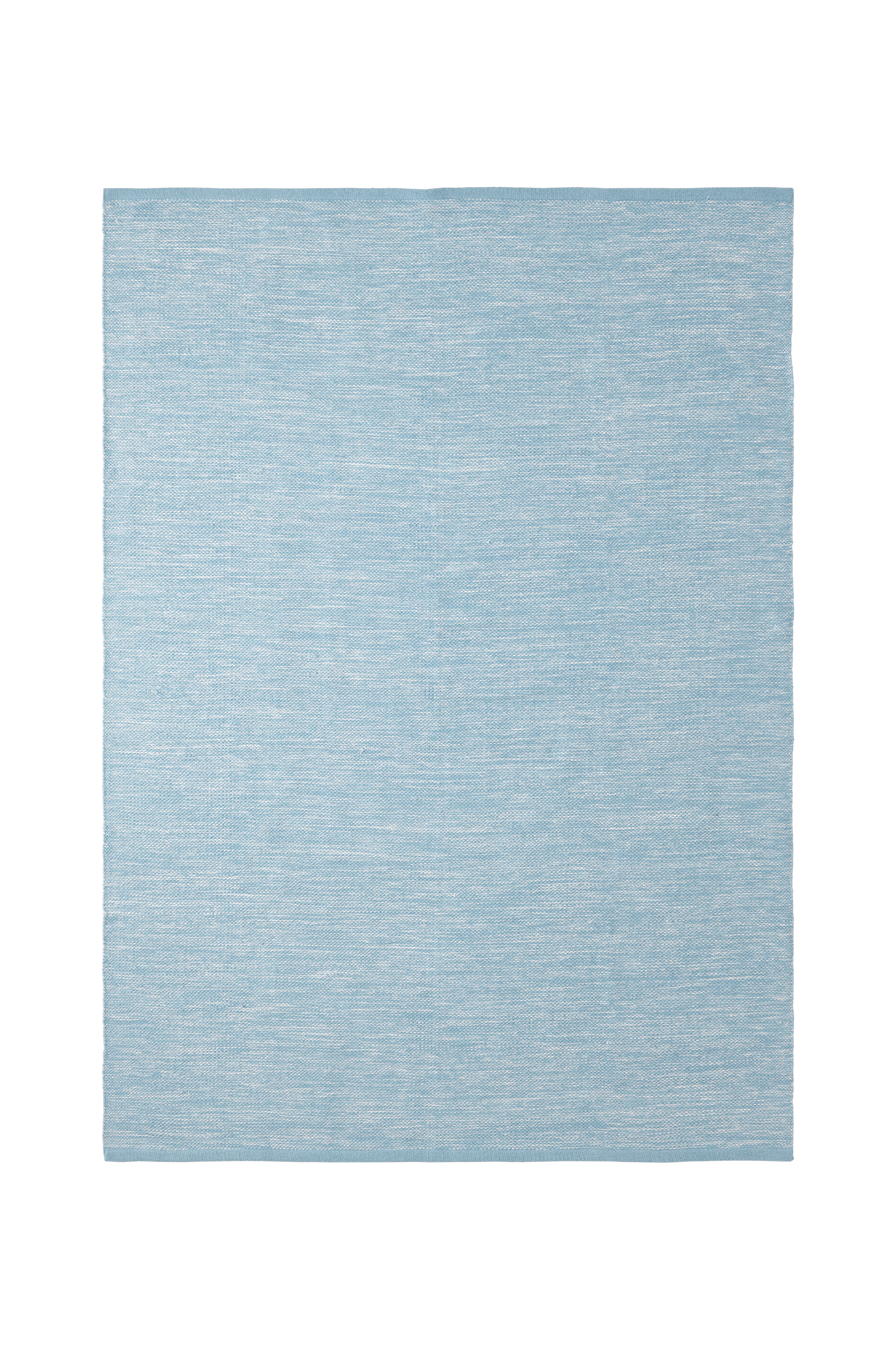 Glatvævet bomuldstæppe i melangefarvet garn med ensfarvede borter i enderne. Højde 0,5 cm.