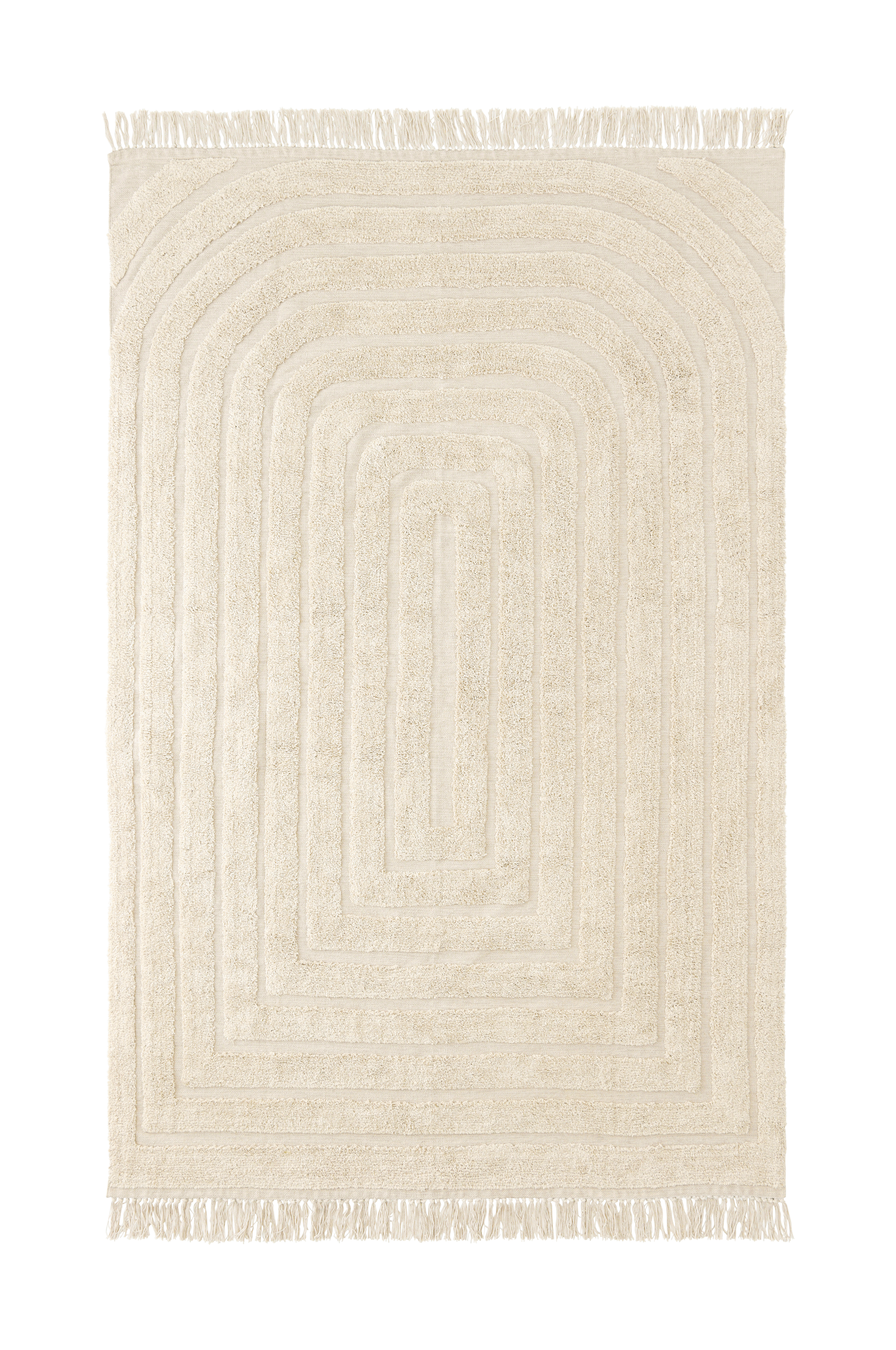 Håndvævet bomuldstæppe med tuftet mønster og knyttede frynser.