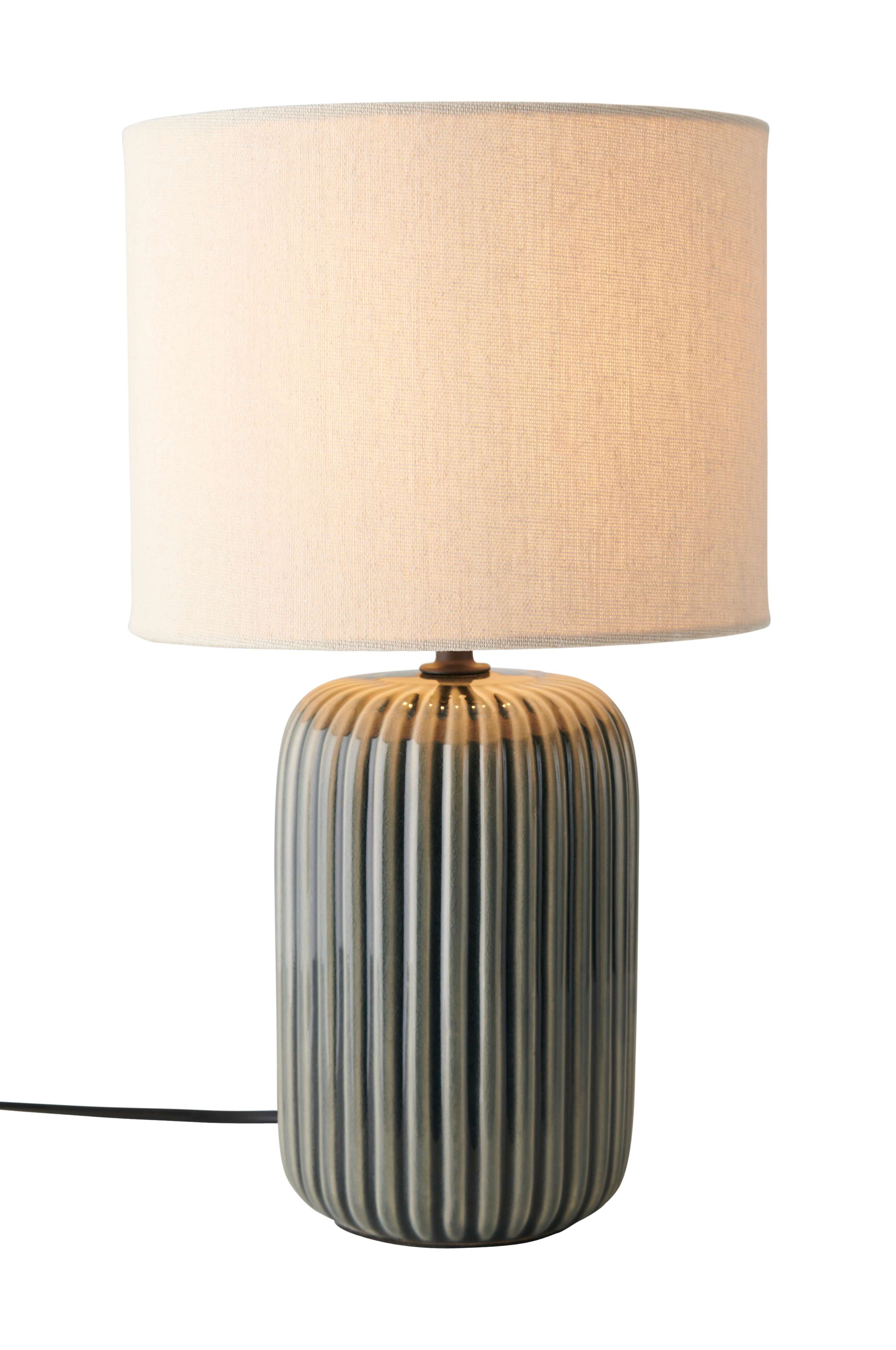 Bordlampe med fod af glaseret keramik med rillet struktur. Skærm af bomuldstekstil. Plastledning med strømafbryder. Skærmens mål: Diameter 20 cm, højde 16 cm. Lampefodens mål: Diameter 11 cm, højde 19 cm. Pære medfølger ikke.