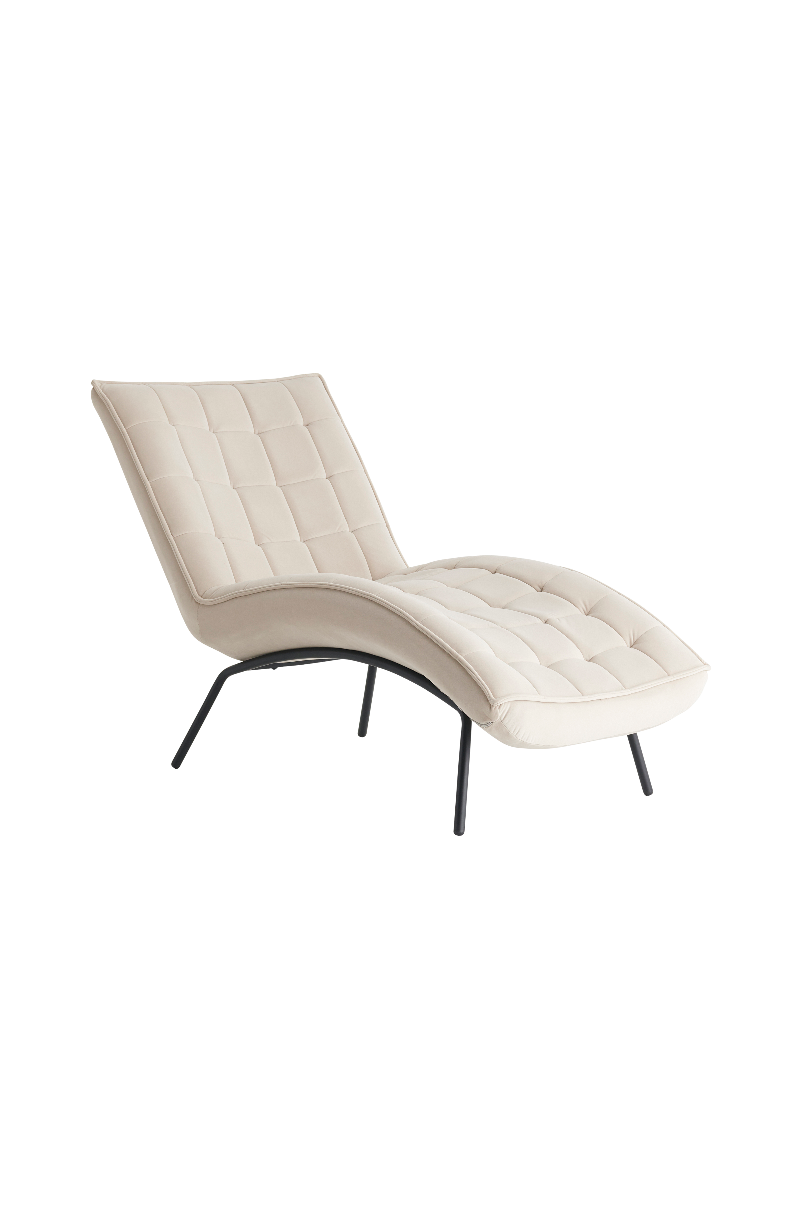 Daybed med paspoleret kant rundt om. Betræk i velour af polyester med indfældninger, der danner et dekorativt ternet mønster. Skumfyld. Ben af metal.