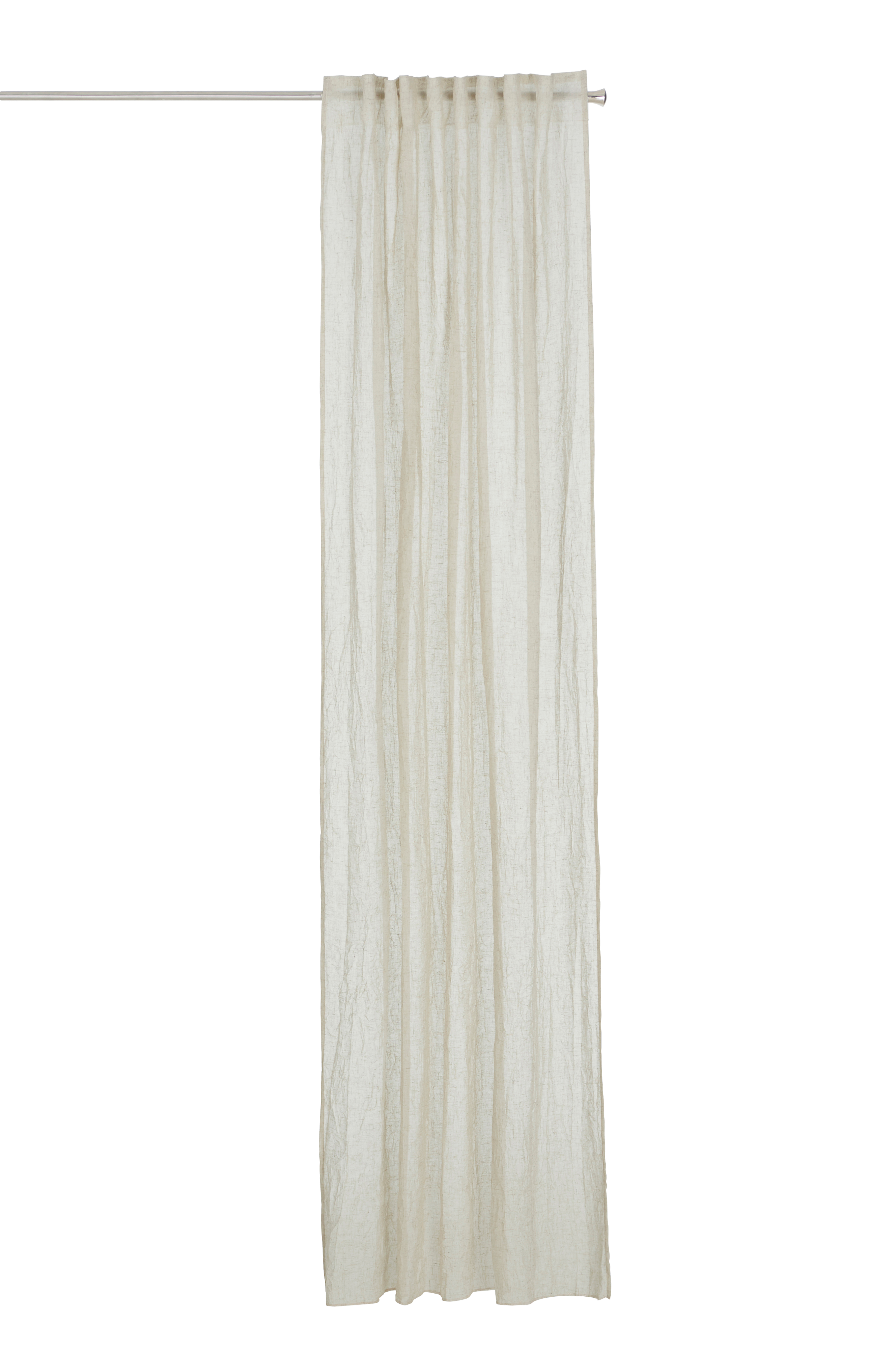 To gardiner med multibånd i tynd, luftig og let crepet hørvoile. Multibåndet gør, at du enten kan hænge gardinerne direkte på en gardinstang gennem de skjulte stropper eller anvende ringe og nålekroge (ikke fingerkroge). Snoren i rynkebåndet gør, at du let kan skabe ensartede, flotte læg. Overlock på nederkanten. Bredde 130 cm. Tre længder: 220, 250 og 300 cm.